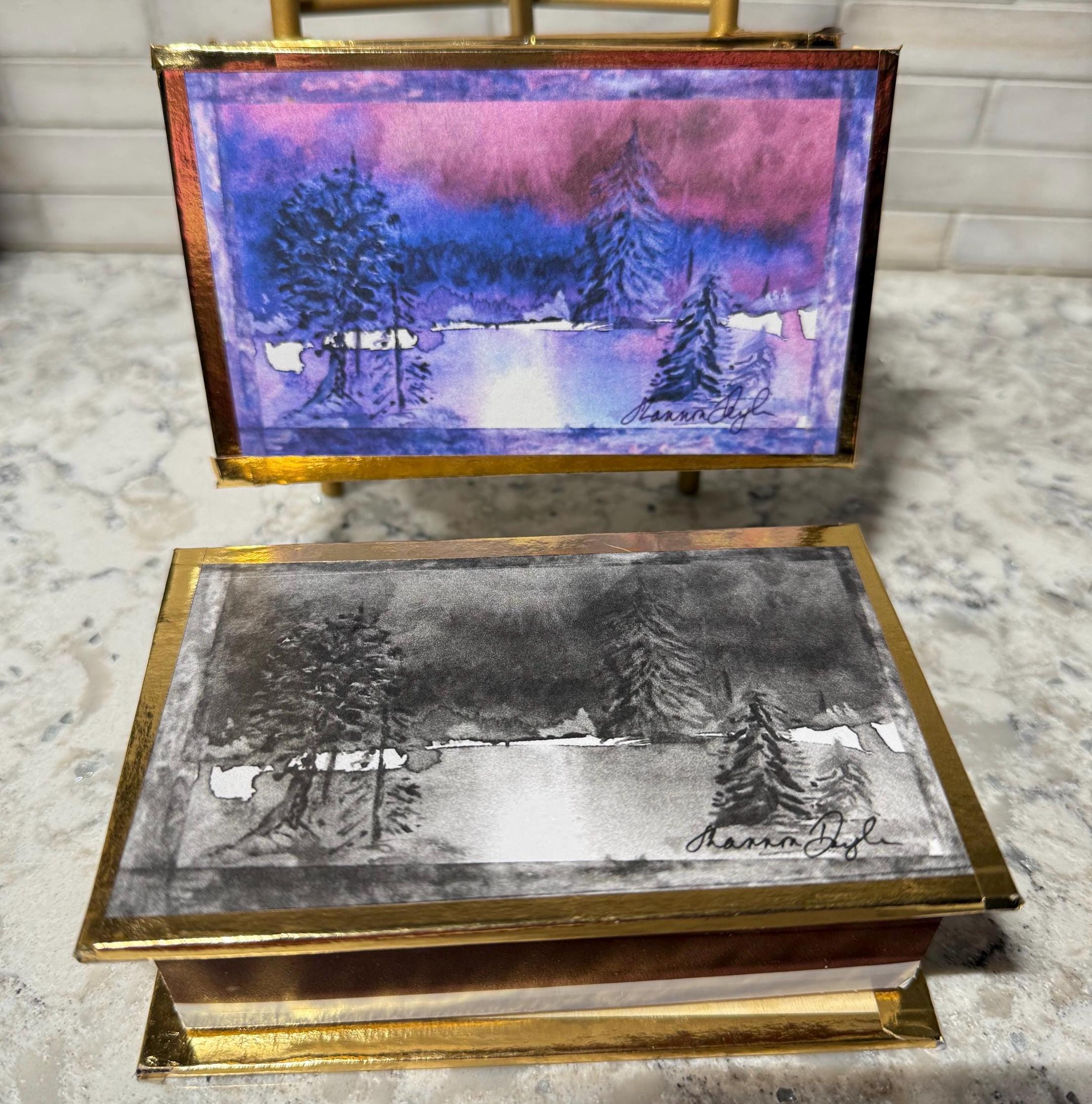 Keep your matches stylishly stored with this wooden match holder, featuring a printed paper art insert of an original winter landscape painting by Shannon Doyle. The artwork captures a serene snowy scene in rich purples and blues, evoking the peaceful beauty of a winter’s night. Crafted from high-quality wood, this match holder is both functional and decorative, making it a perfect addition to any cozy home.