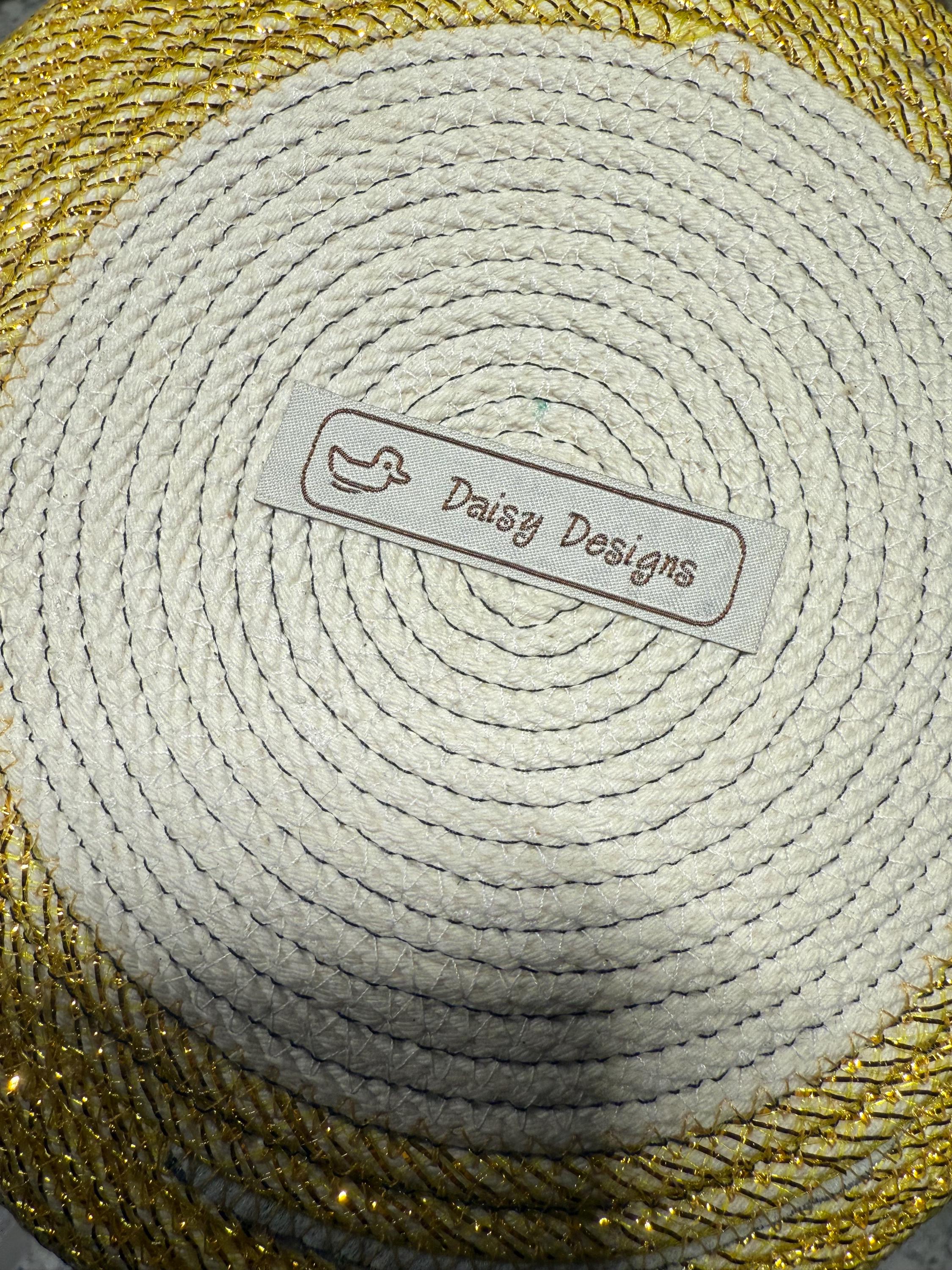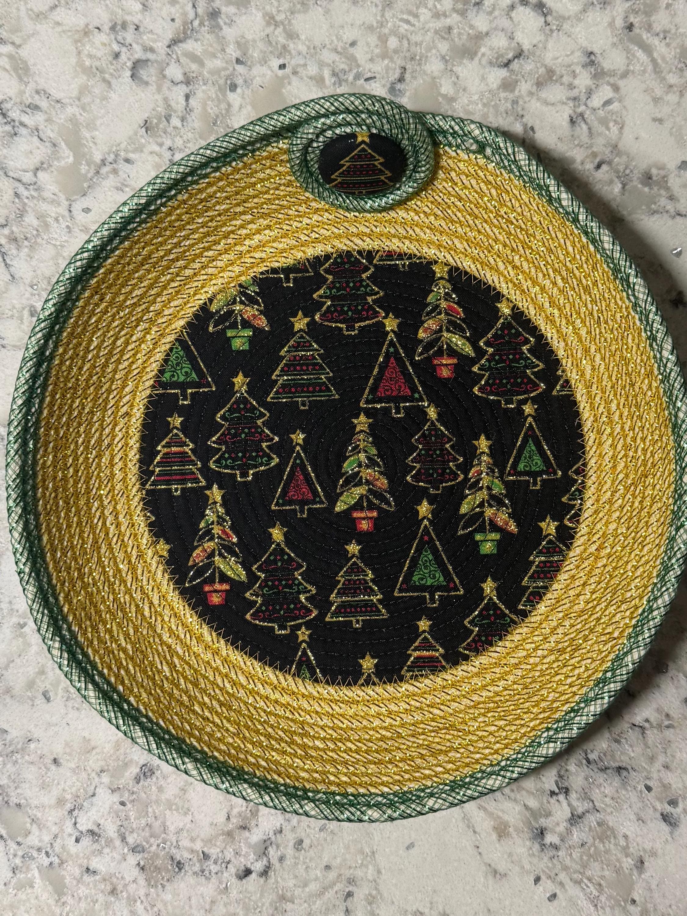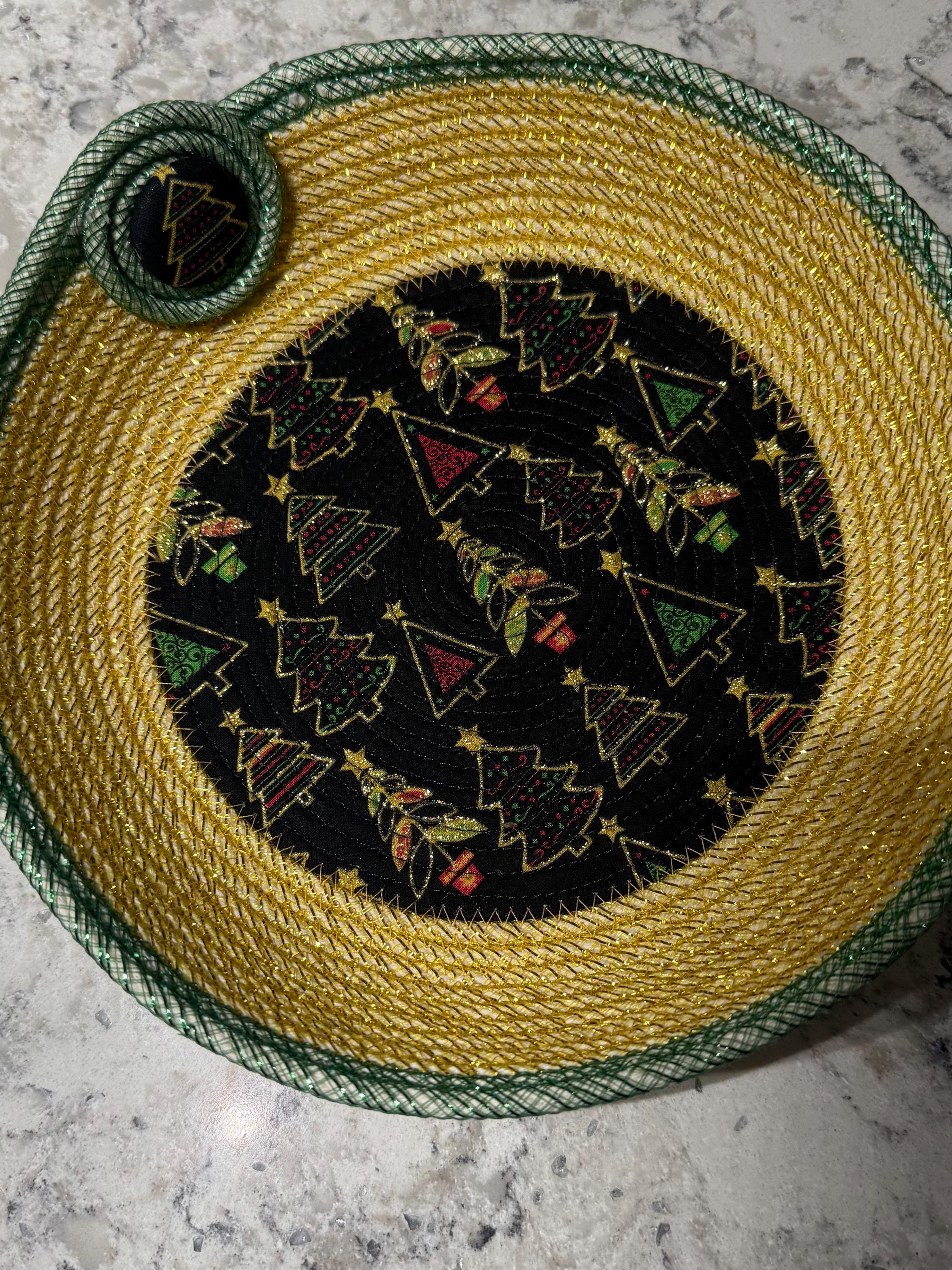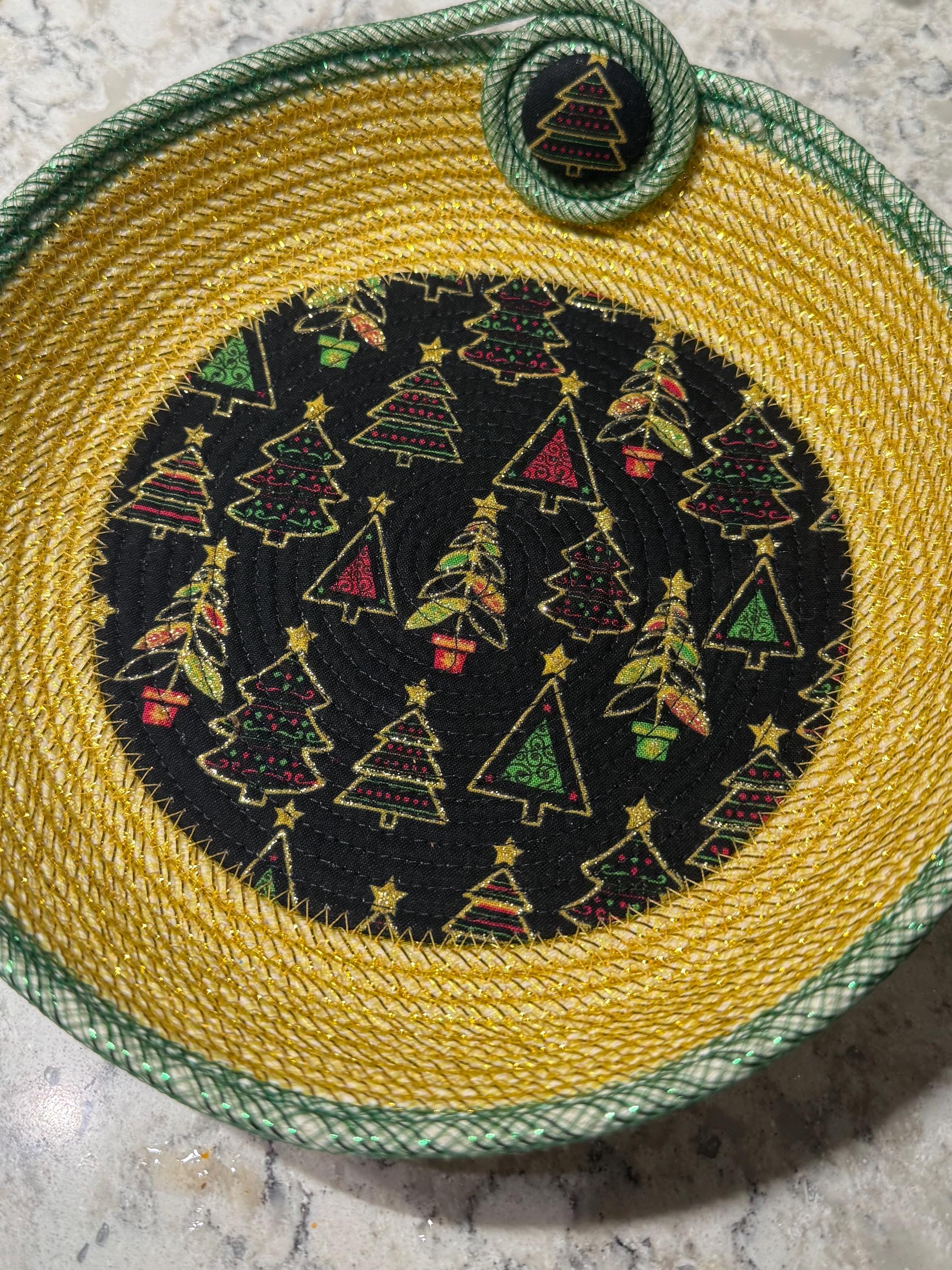 Add a touch of holiday cheer to your home with this beautifully handcrafted Christmas rope basket! Featuring a festive fabric center adorned with golden Christmas trees on a black background, this decorative bowl is wrapped in gold and green rope accents, creating a warm and elegant seasonal piece.