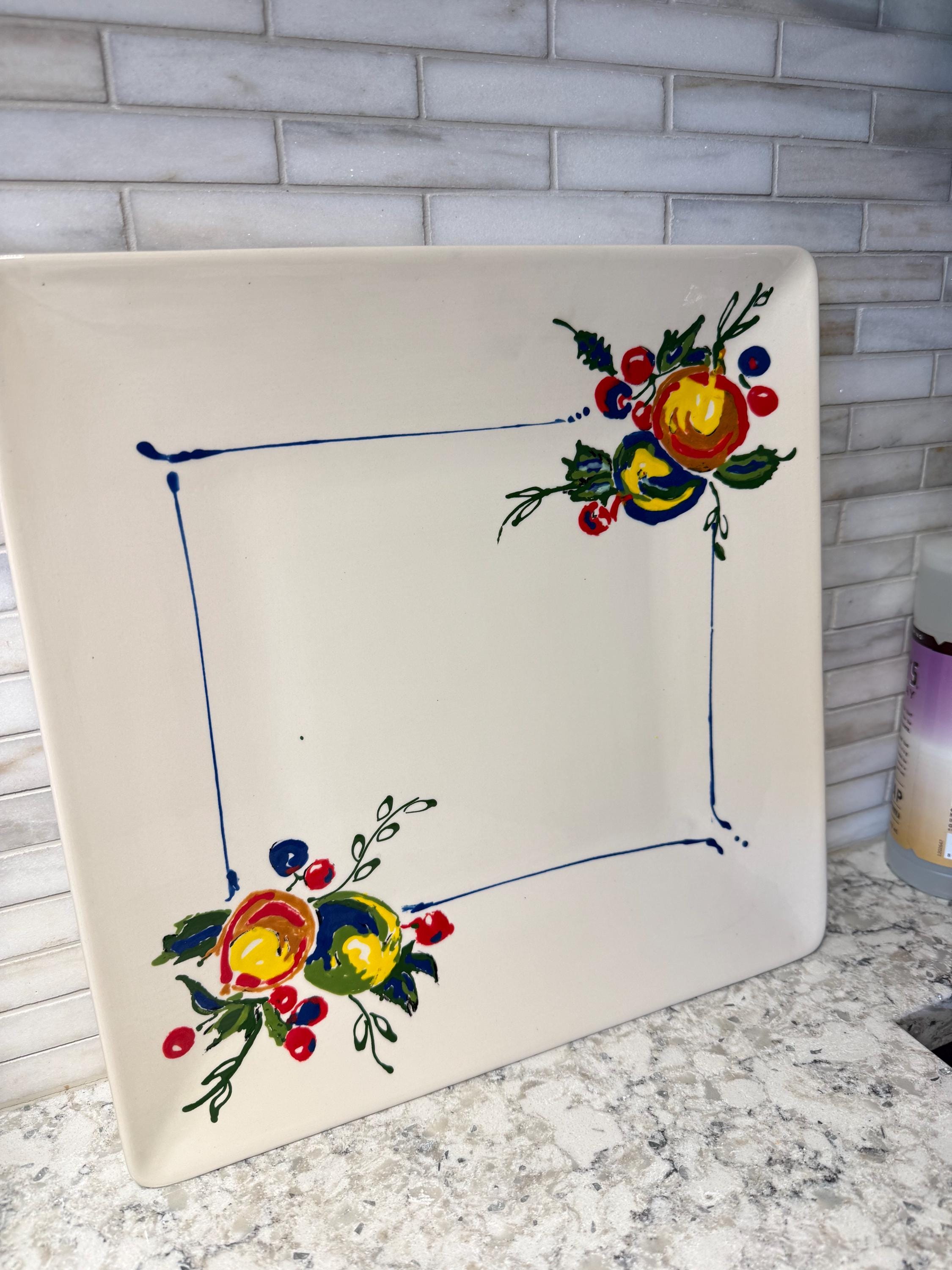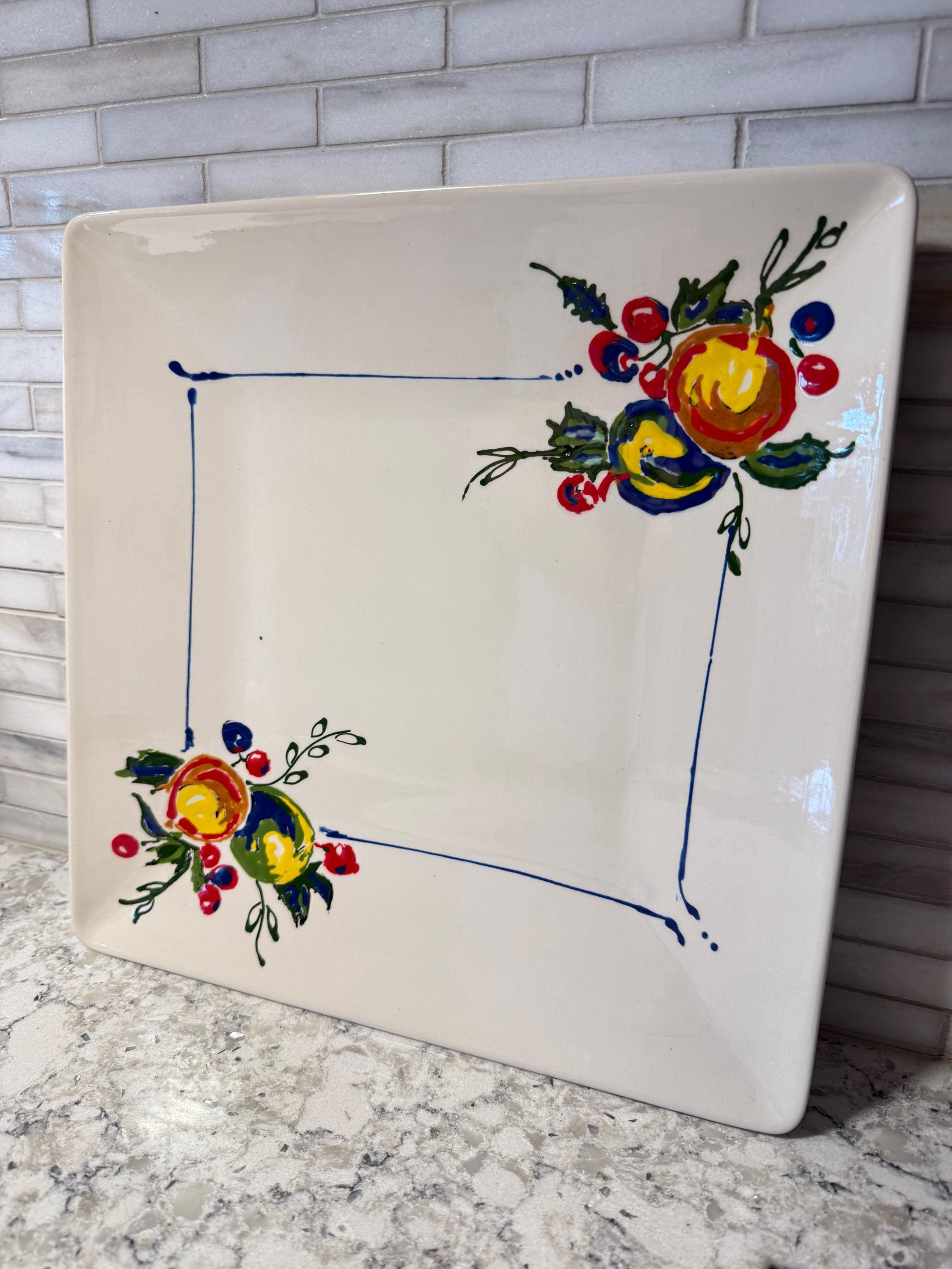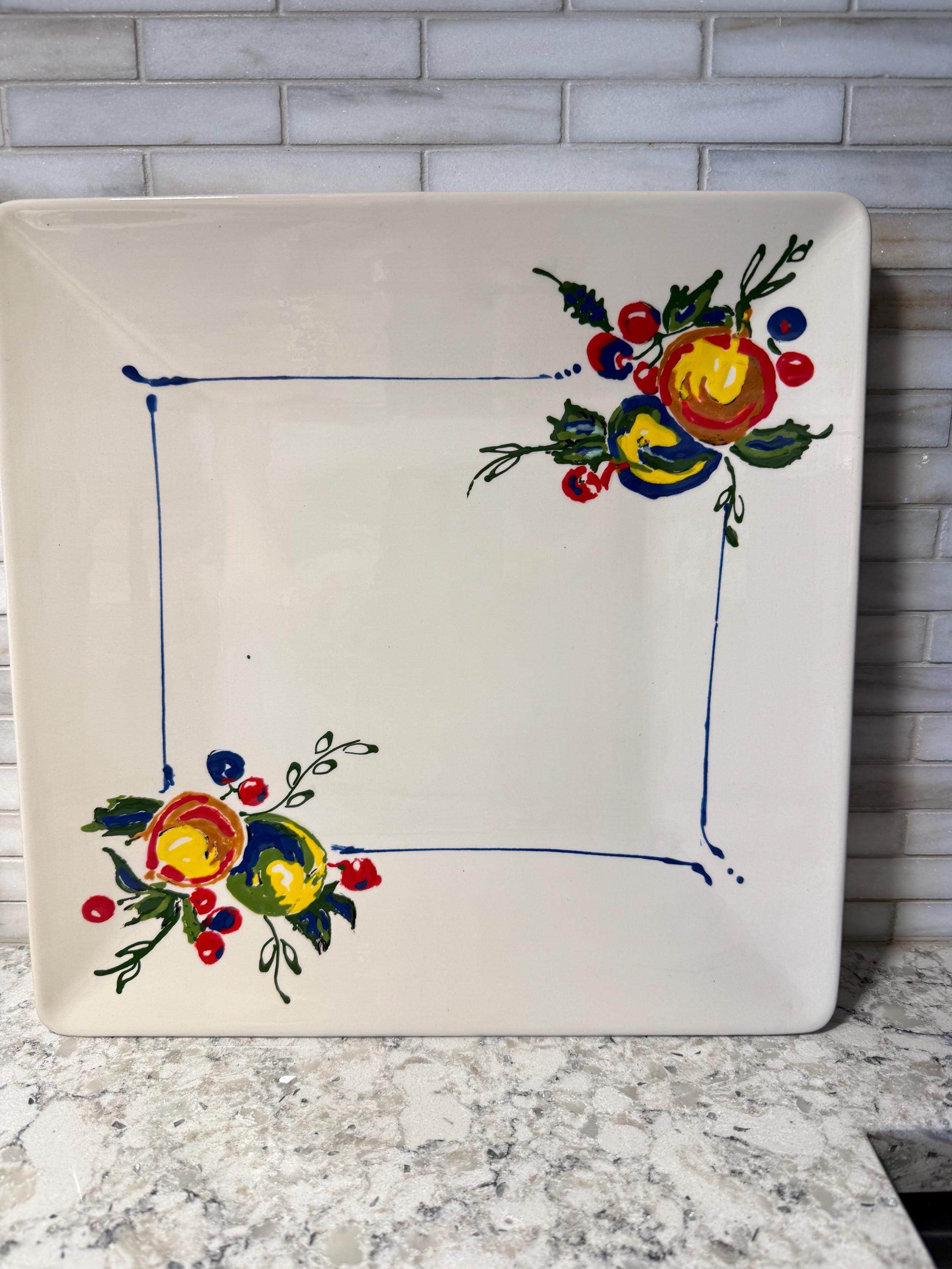 Bring bold, joyful color to your home with this one-of-a-kind hand-painted ceramic platter by artist Shannon Doyle. Featuring vibrant florals in red, pink, green, and cobalt blue, this rectangular tray is a functional piece of art perfect for entertaining or display.