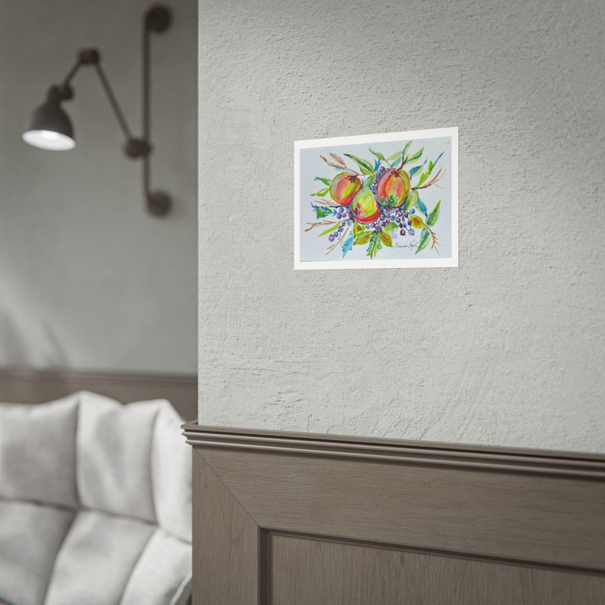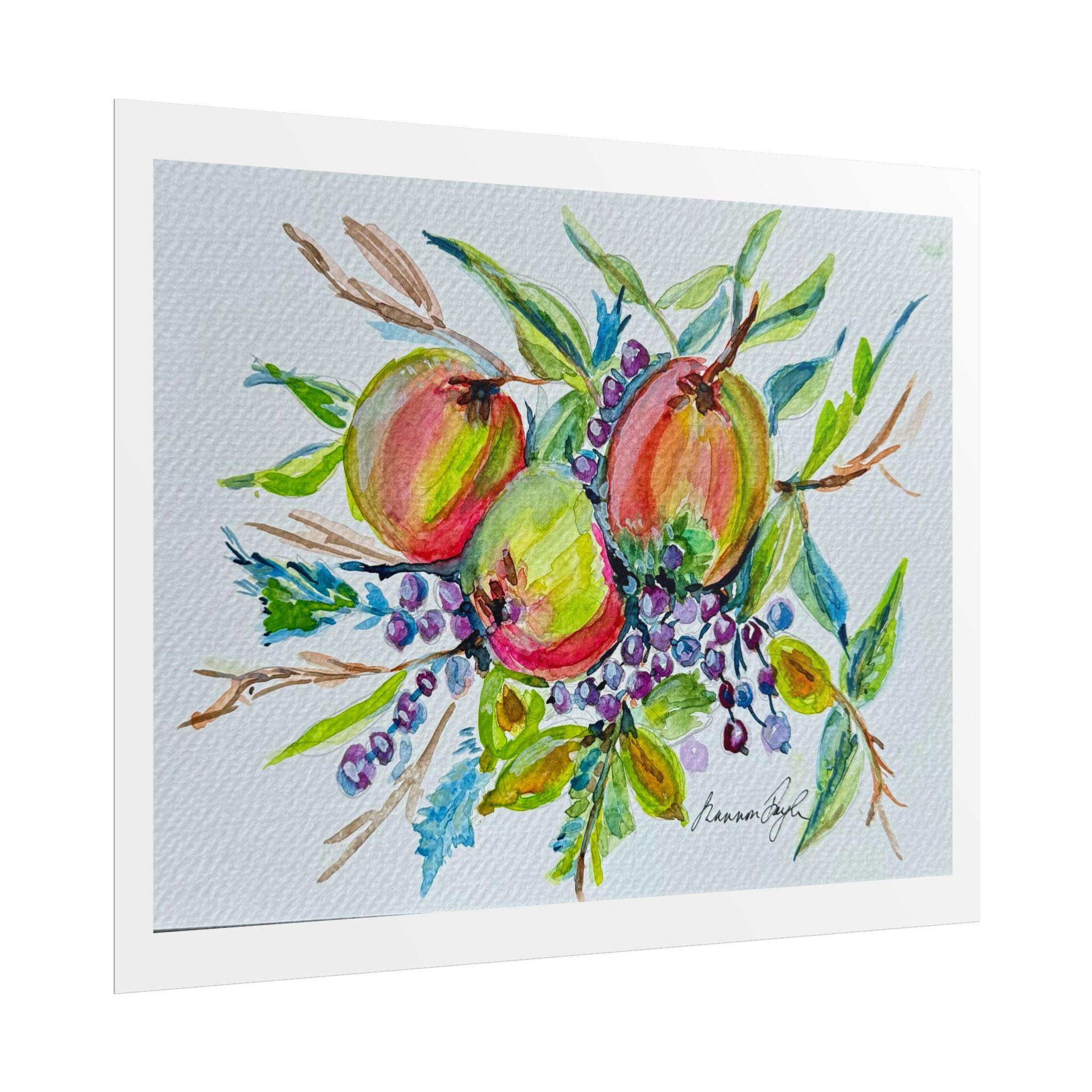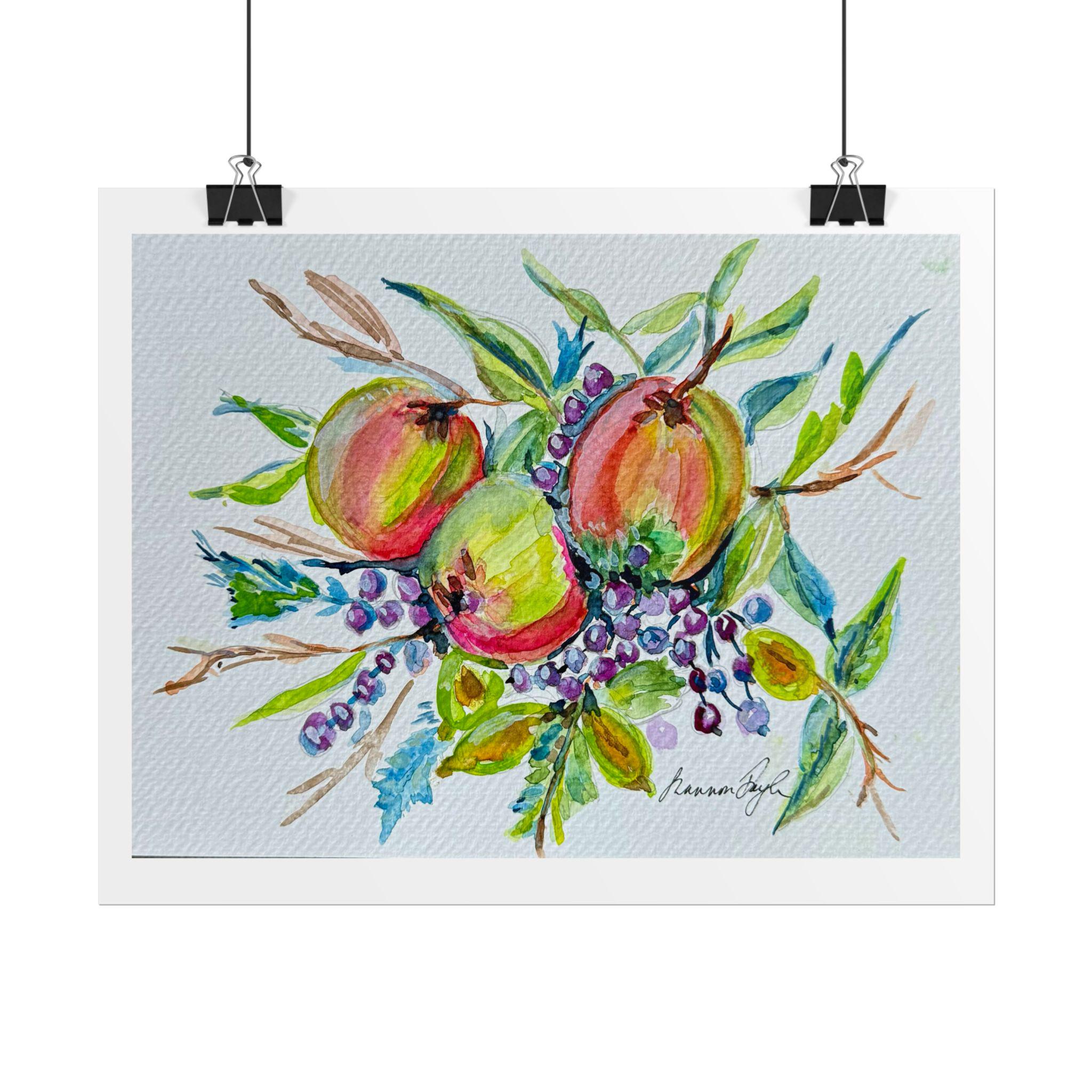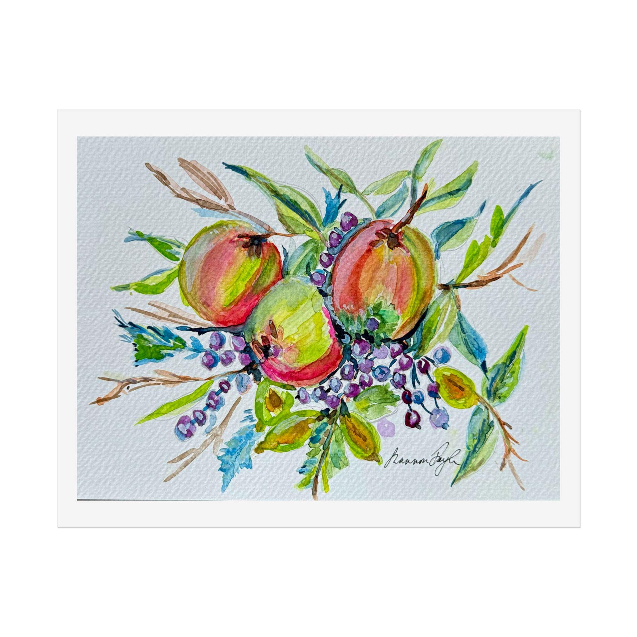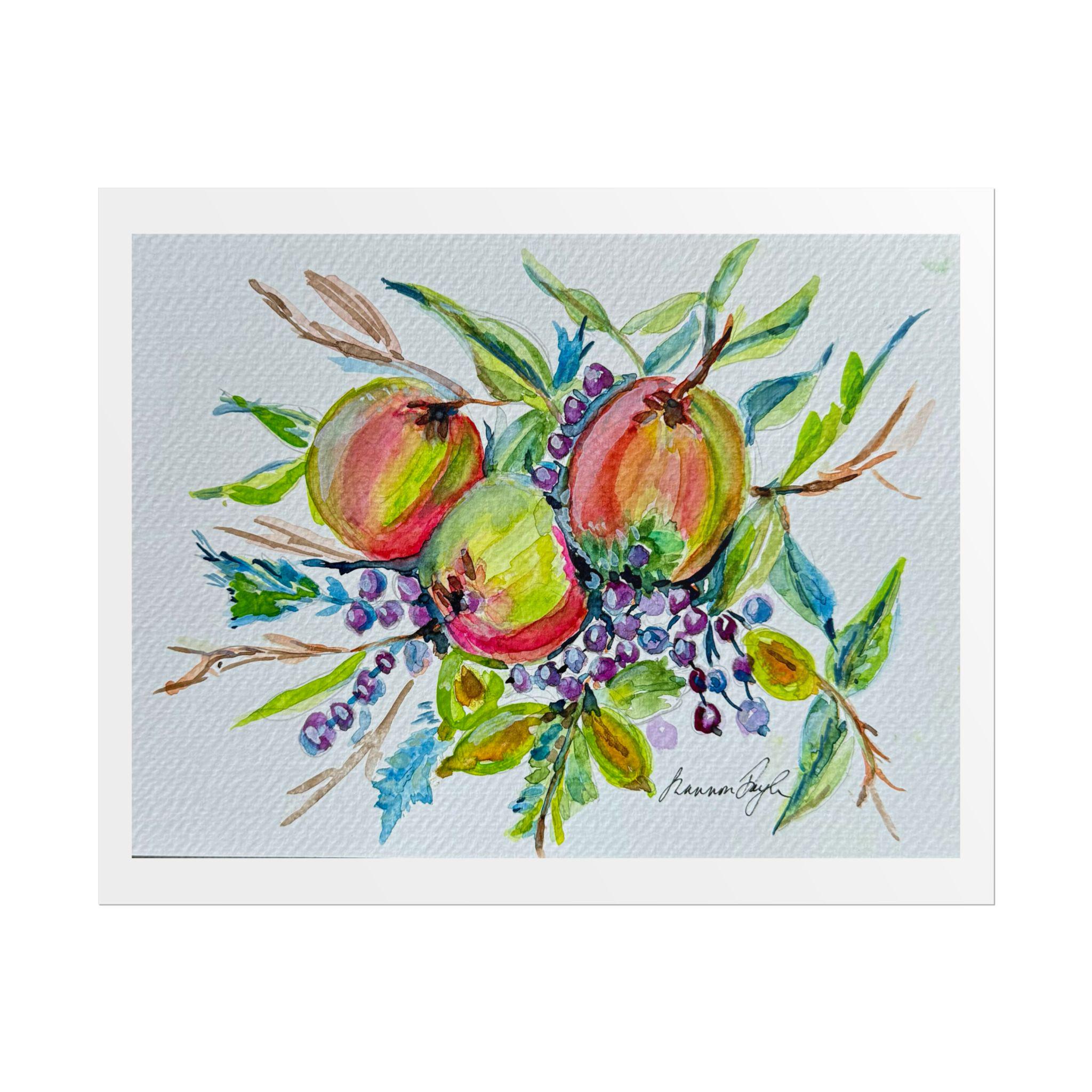 Artwork: High-resolution digital reproduction of an original watercolor painting featuring round, colorful fruits (apples/peaches) with green leaves and clusters of purple/blue berries.