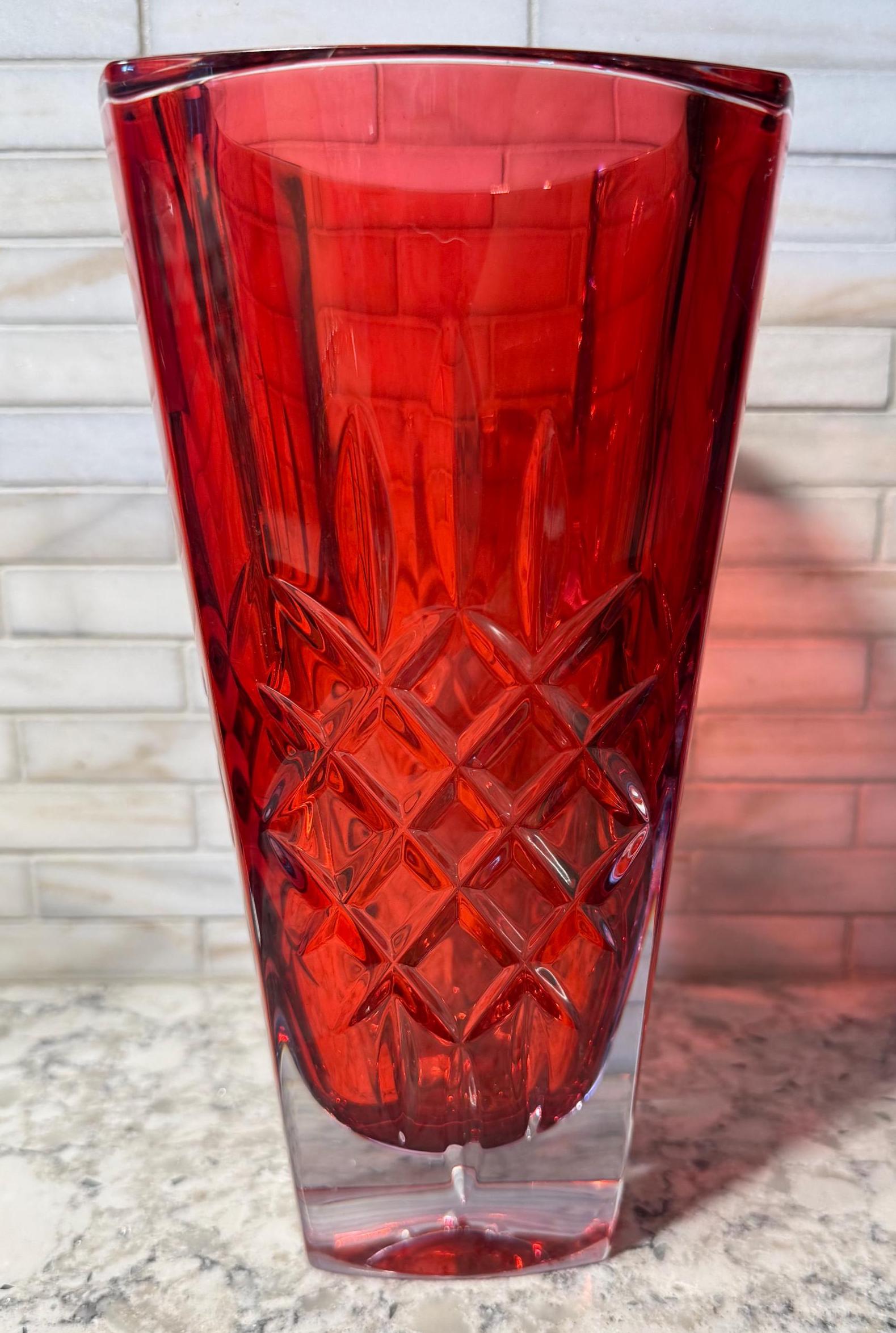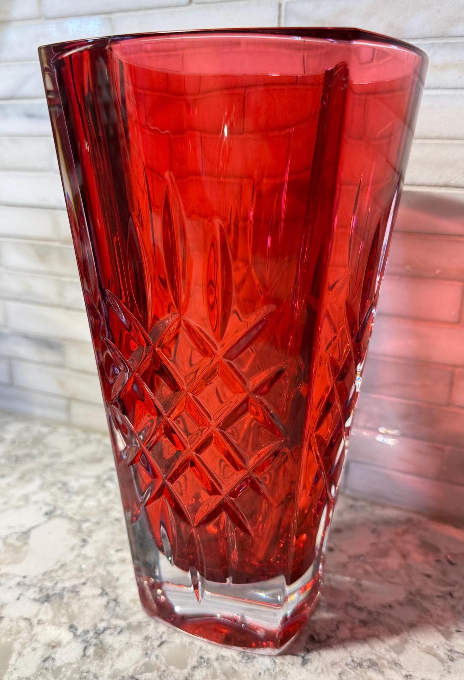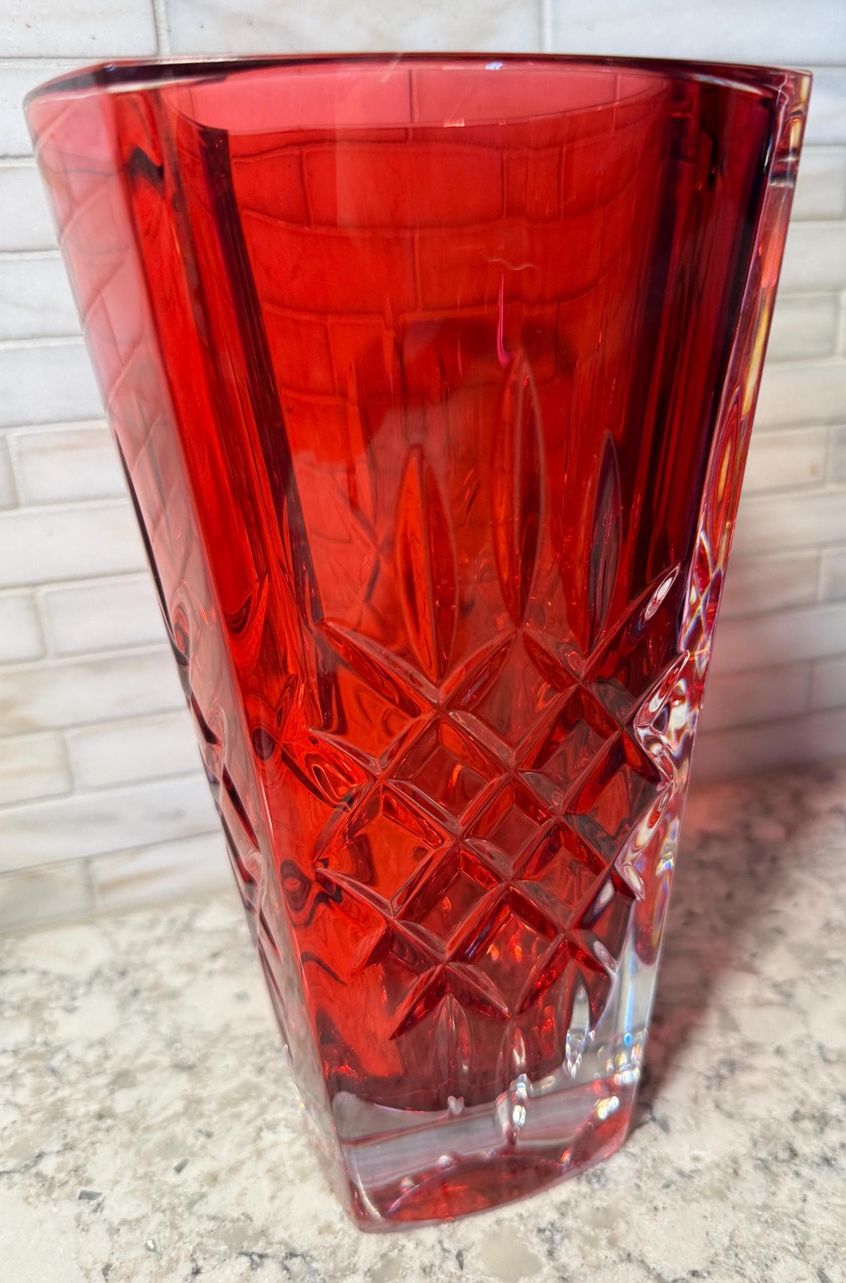 This magnificent vintage Waterford Lismore vase is a truly exceptional find. Standing approximately 10 inches tall, this hand-cut lead crystal vase is crafted in a stunning, deep ruby red hue that commands attention. The rich color beautifully highlights the intricate diamond and wedge cuts of the world-renowned Lismore pattern, creating a dazzling display as light passes through.