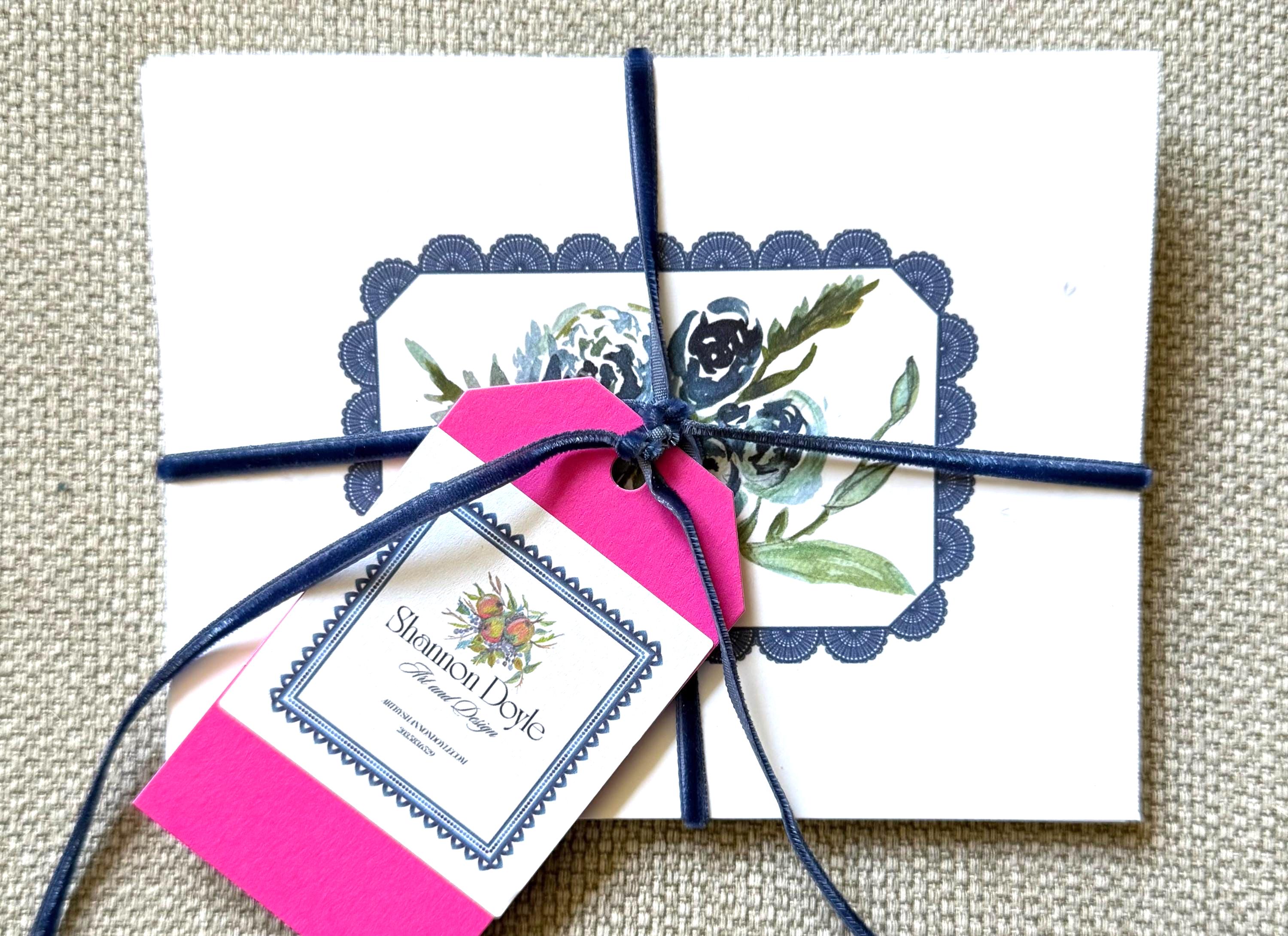 Share a piece of original artistry with these exquisite botanical notecards by Shannon Doyle. Each card in this set of five features a unique, vibrant watercolor illustration of fresh fruits and berries, beautifully framed by a delicate, hand-stitched border. Perfect for sending heartfelt messages, these blank greeting cards offer a touch of elegance and natural beauty for any occasion."