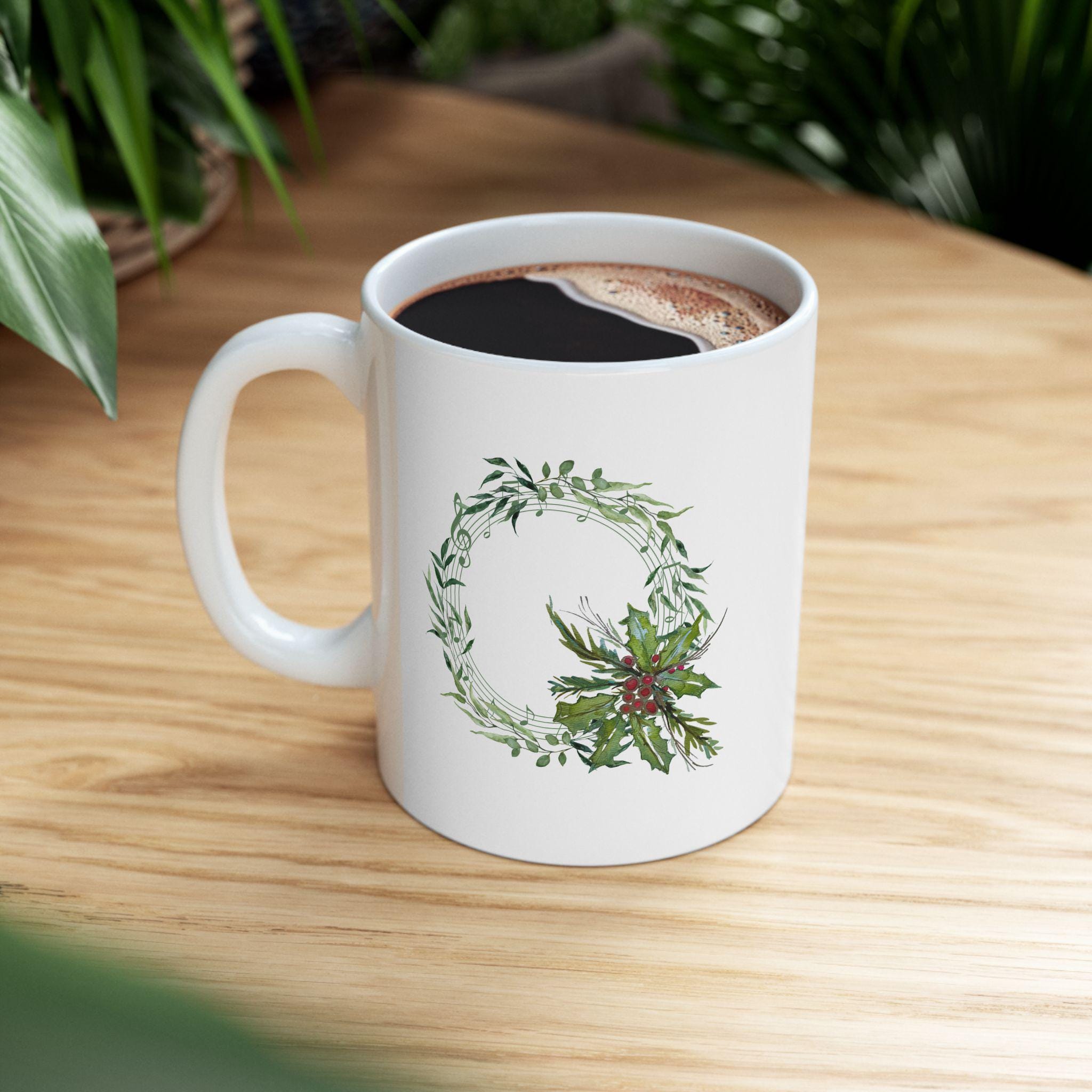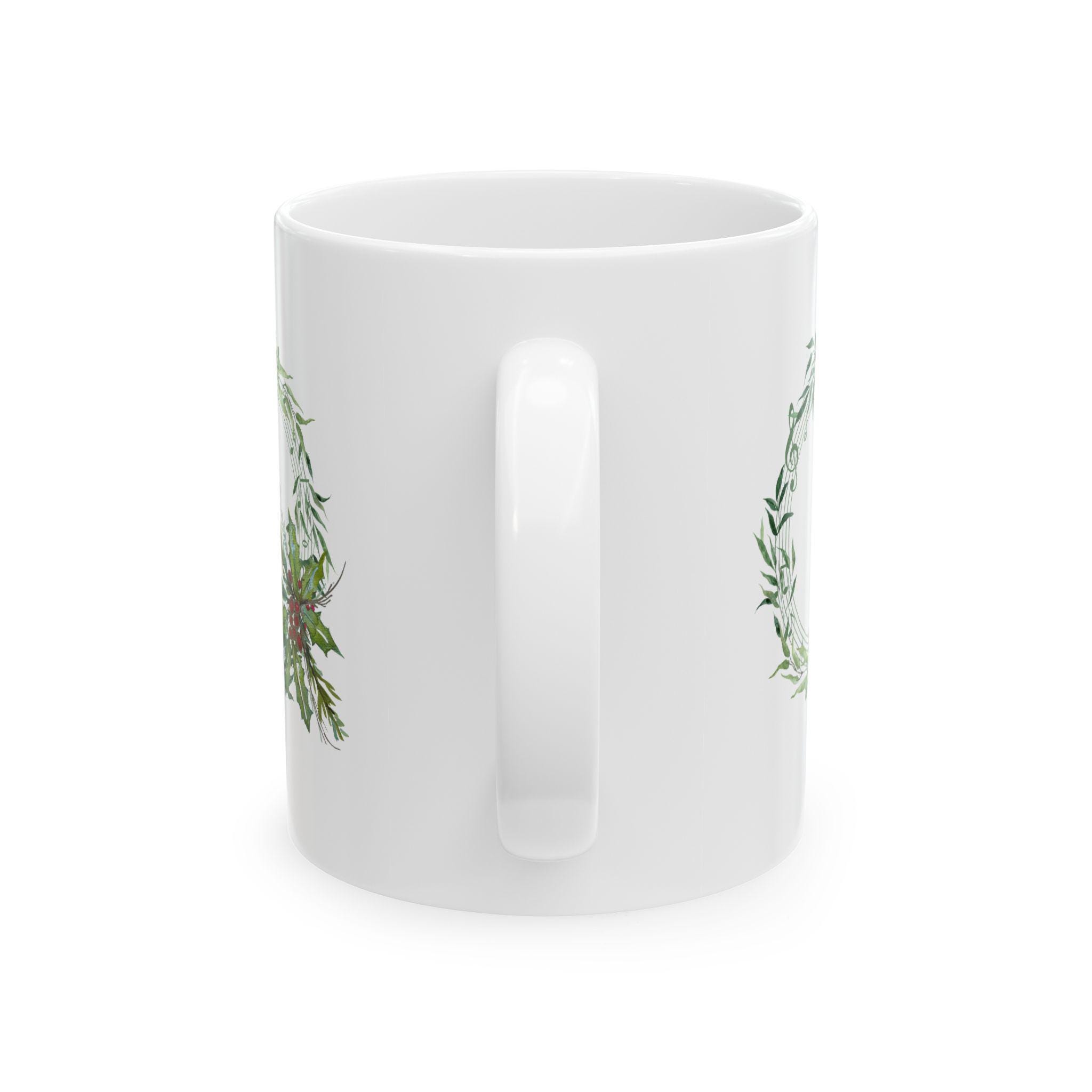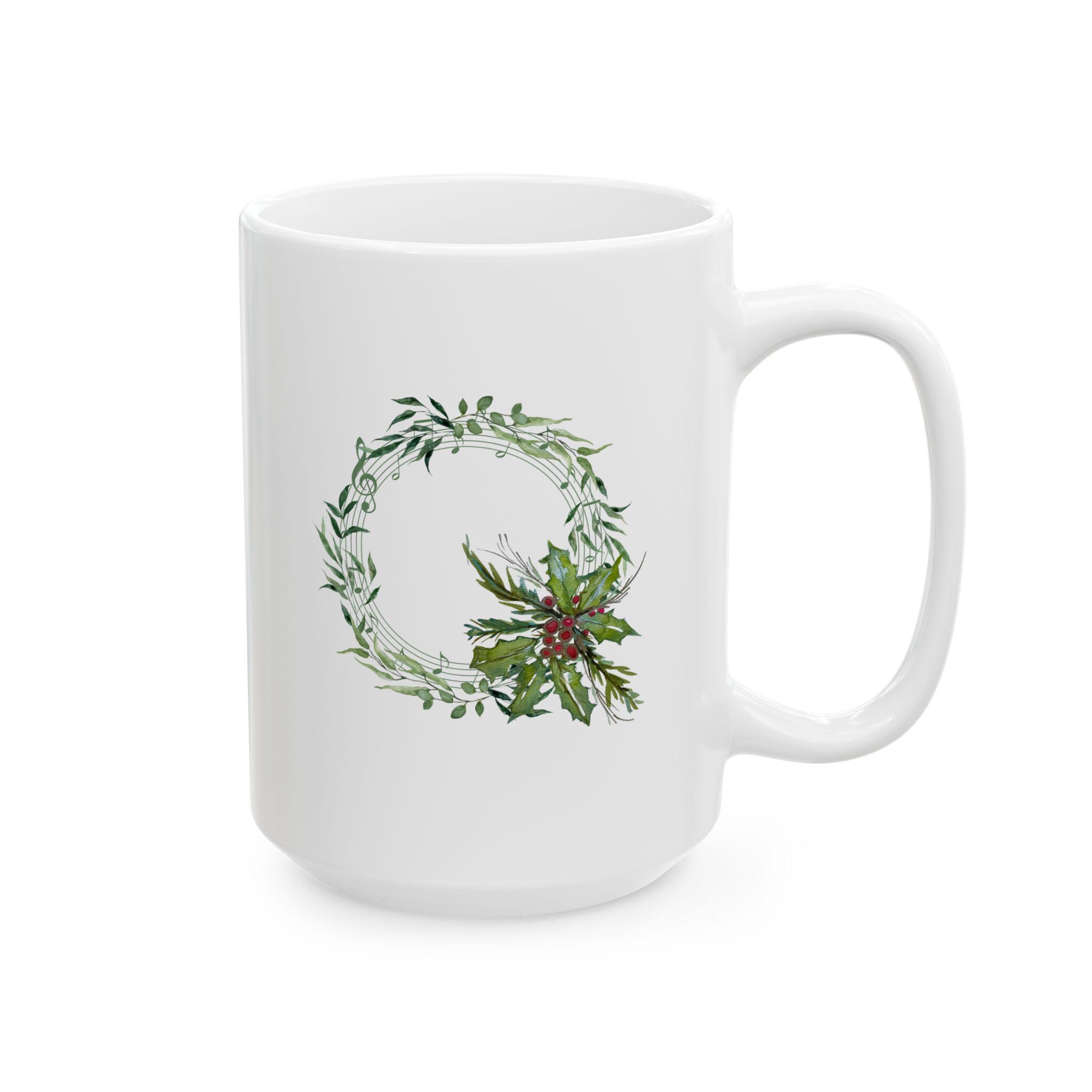 Christmas mug, holiday coffee mug, music wreath mug, watercolor mug, Shannon Doyle art, holly berry cup, ceramic Christmas mug, musician gift, festive tea mug, cozy winter mug, glossy art mug, botanical holiday mug, handmade holiday gift