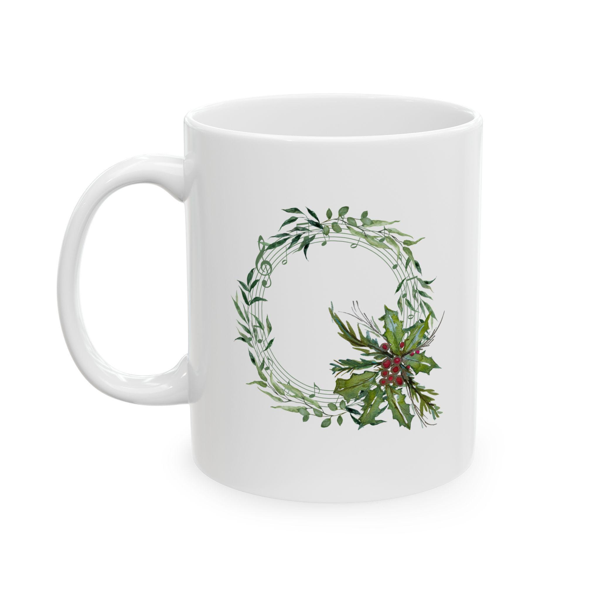 Celebrate the season with this unique ceramic mug adorned with a hand-painted watercolor wreath of holly leaves and berries, delicately entwined with musical notes. Created from original artwork by Shannon Doyle, this mug brings together the charm of nature and the joy of music for a heartwarming winter design.