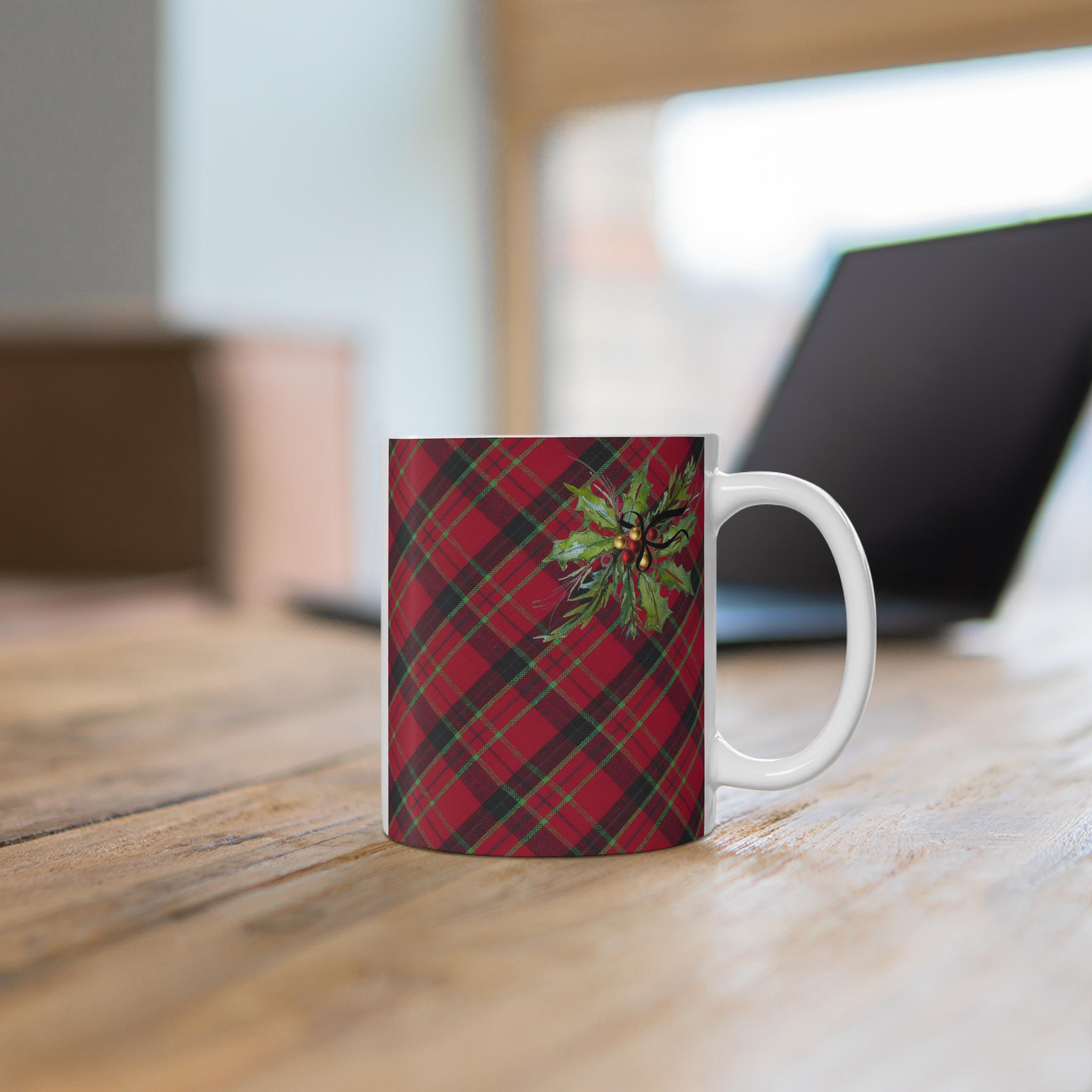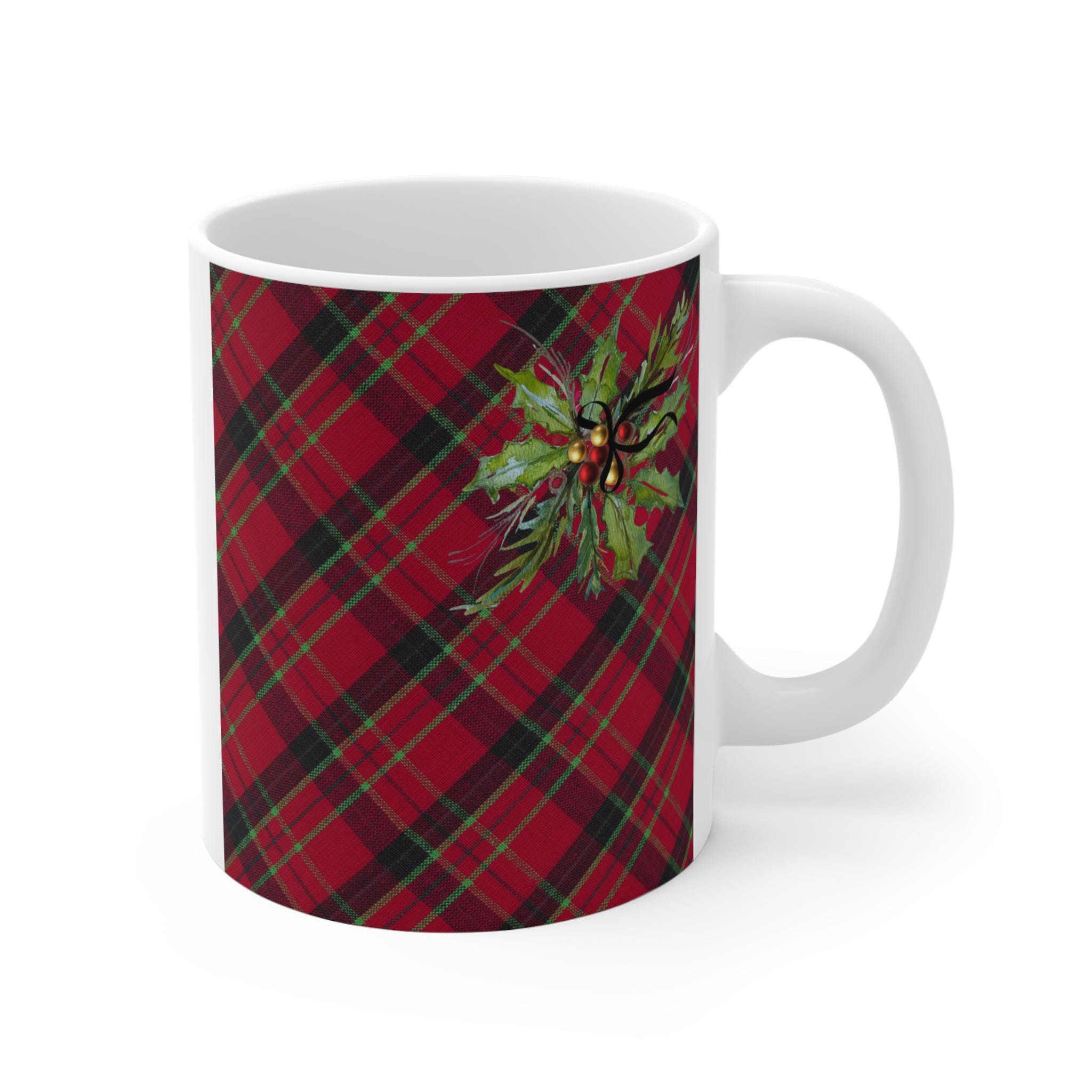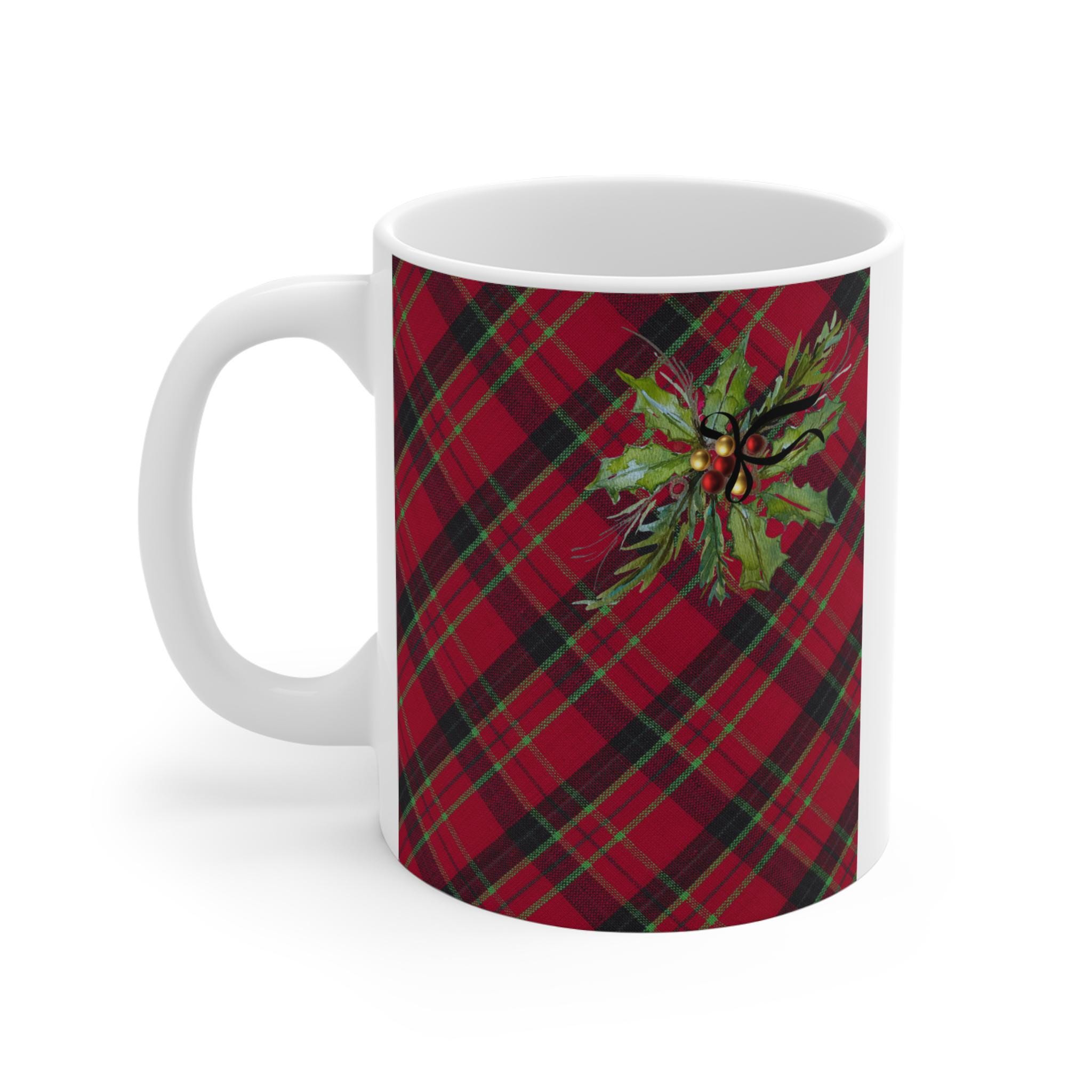 tartan Christmas mug, holiday plaid coffee cup, watercolor holly mug, Shannon Doyle art, black ribbon holly design, Scottish holiday decor, ceramic winter mug, festive tea mug, holiday kitchen gift, classic red green plaid, rustic Christmas gift, cozy cabin cup, handmade holiday mug