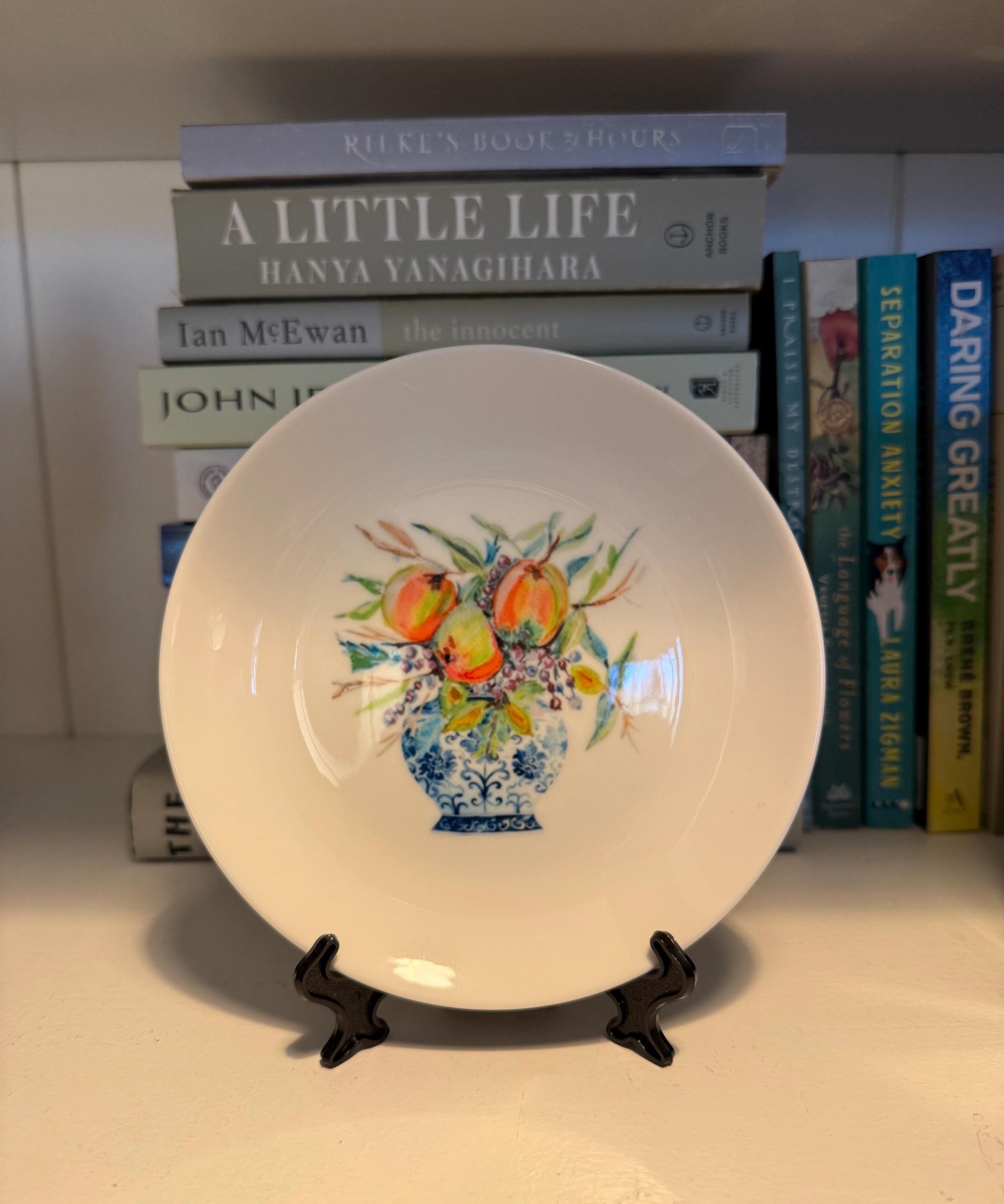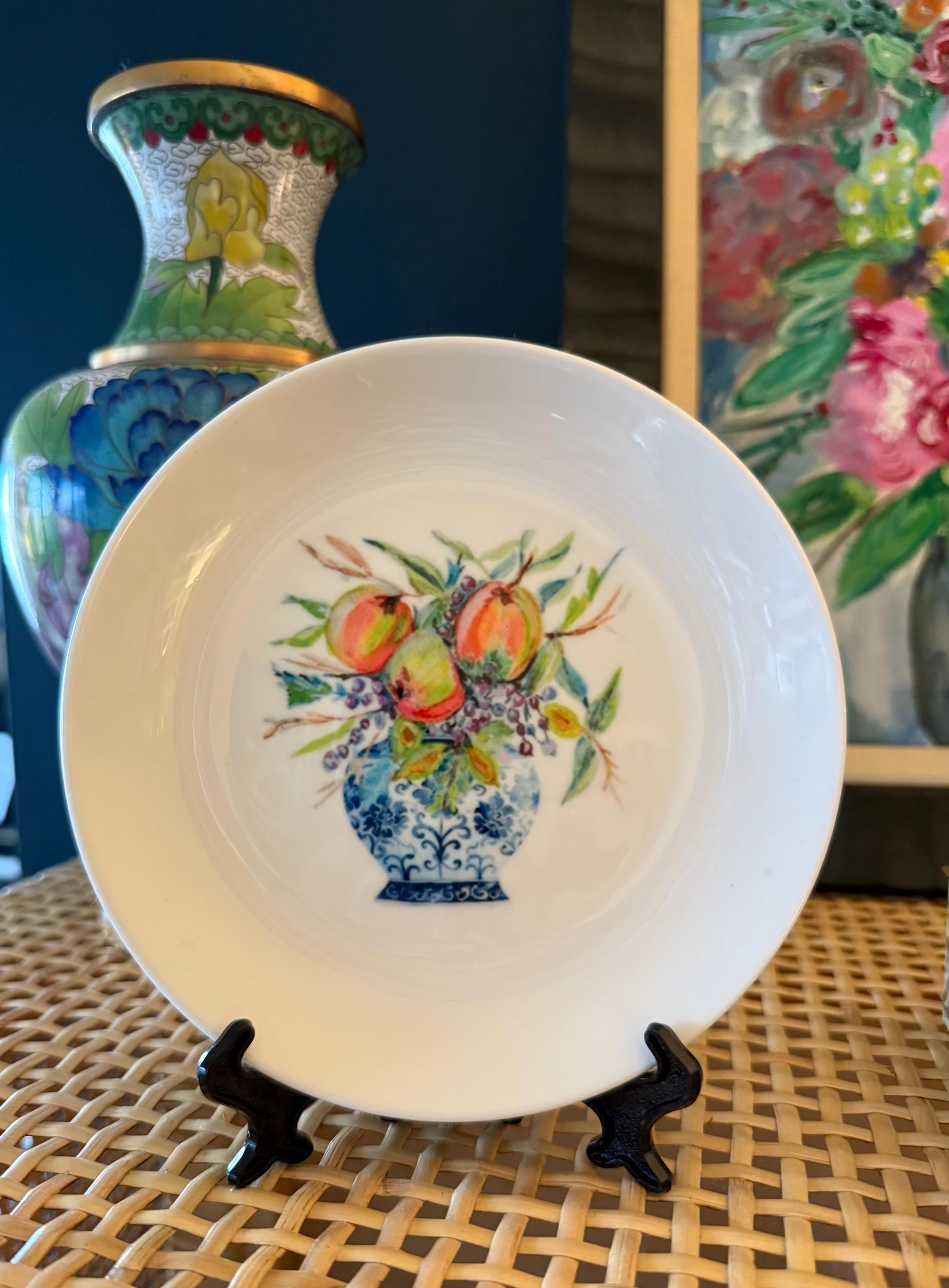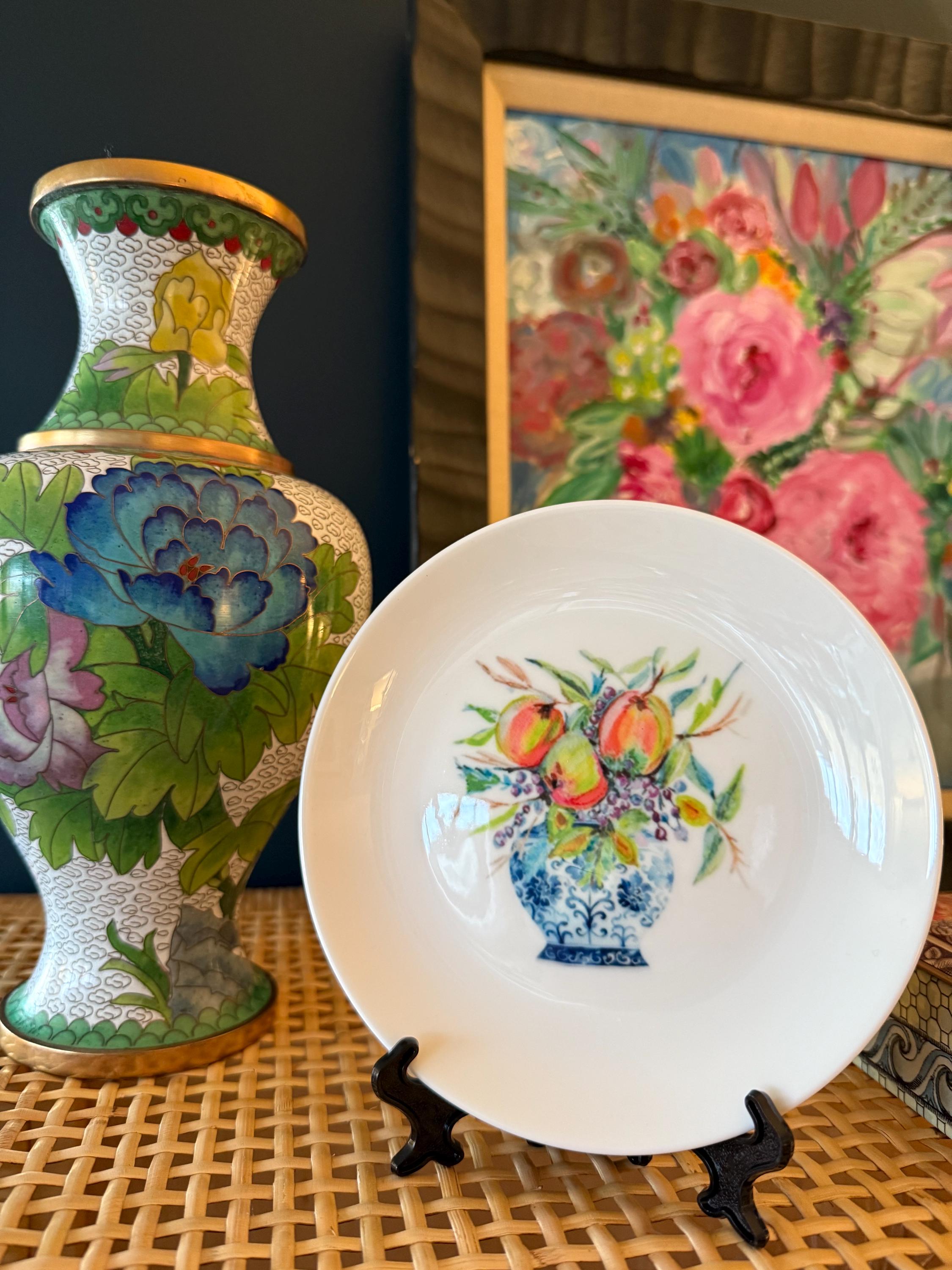 Bring a touch of vibrant artistry to your home with this 7-inch decorative plate featuring an original botanical and fruit illustration by artist Shannon Doyle. With its cheerful peaches, lush greenery, and classic blue-and-white chinoiserie-style vase, this piece blends traditional elegance with fresh, modern color.