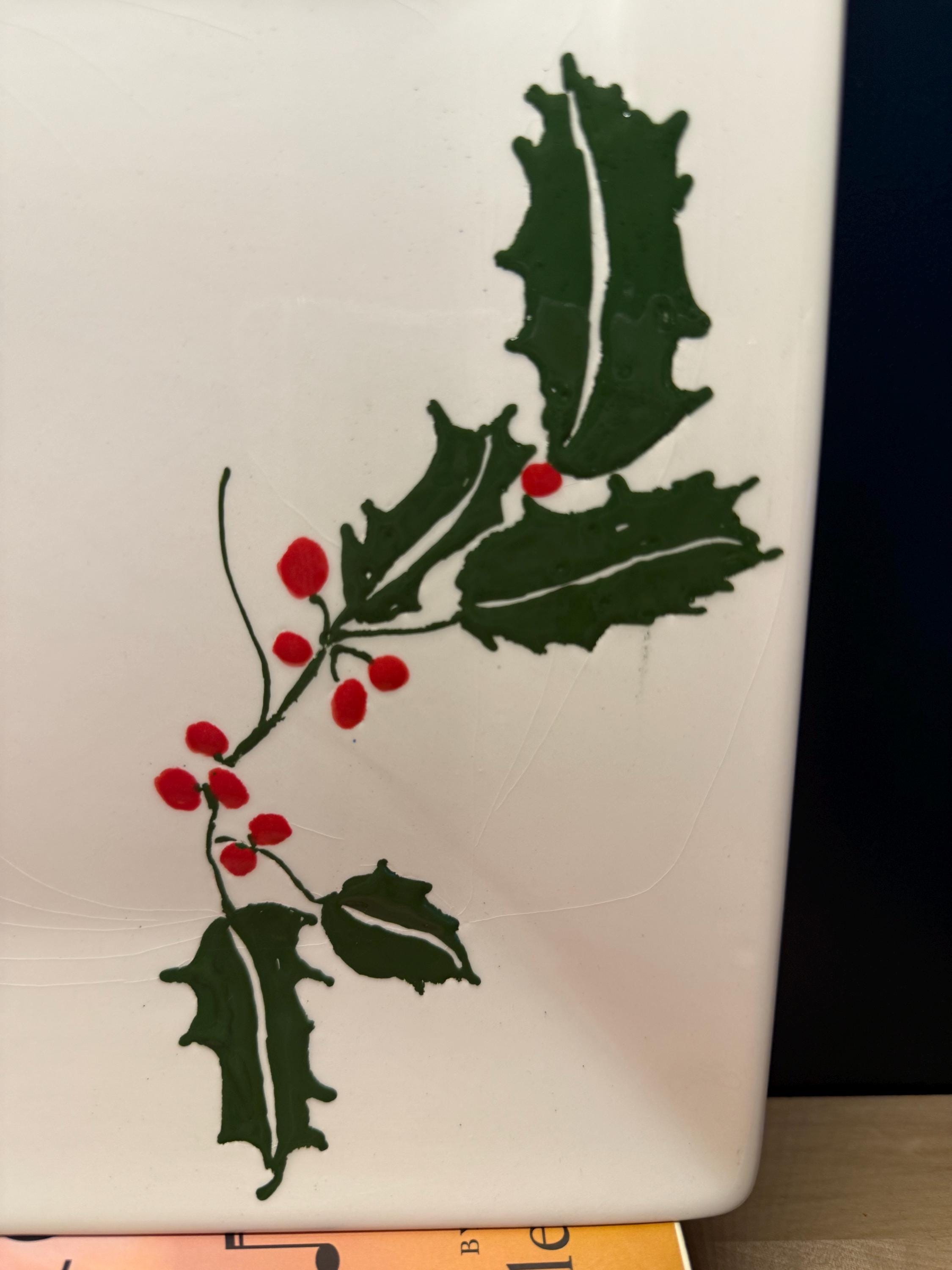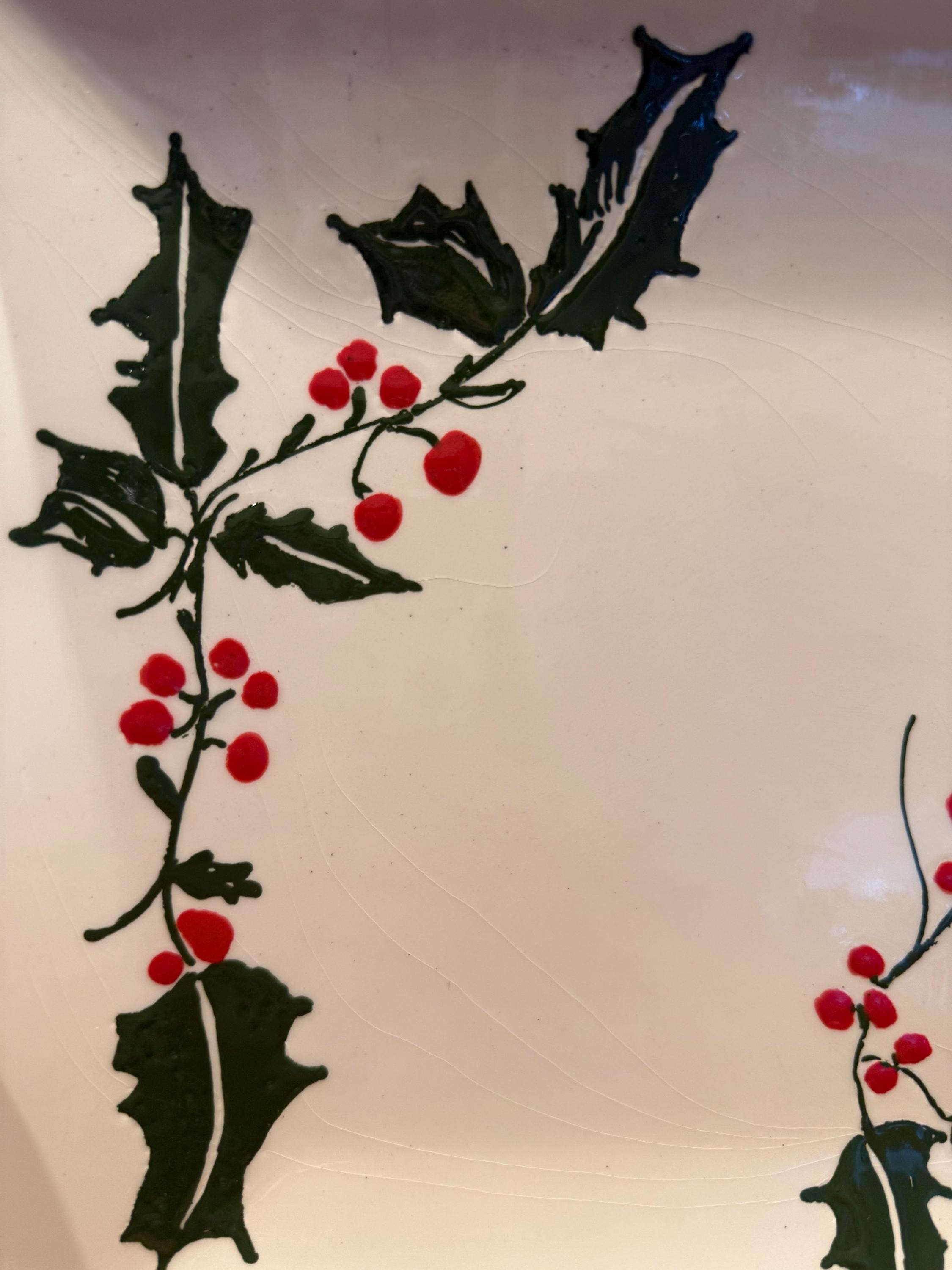 Bring bold, joyful color to your home with this one-of-a-kind hand-painted ceramic platter by artist Shannon Doyle. Featuring vibrant holy and ivy in red, green, and cobalt blue, this rectangular tray is a functional piece of art perfect for entertaining or display.