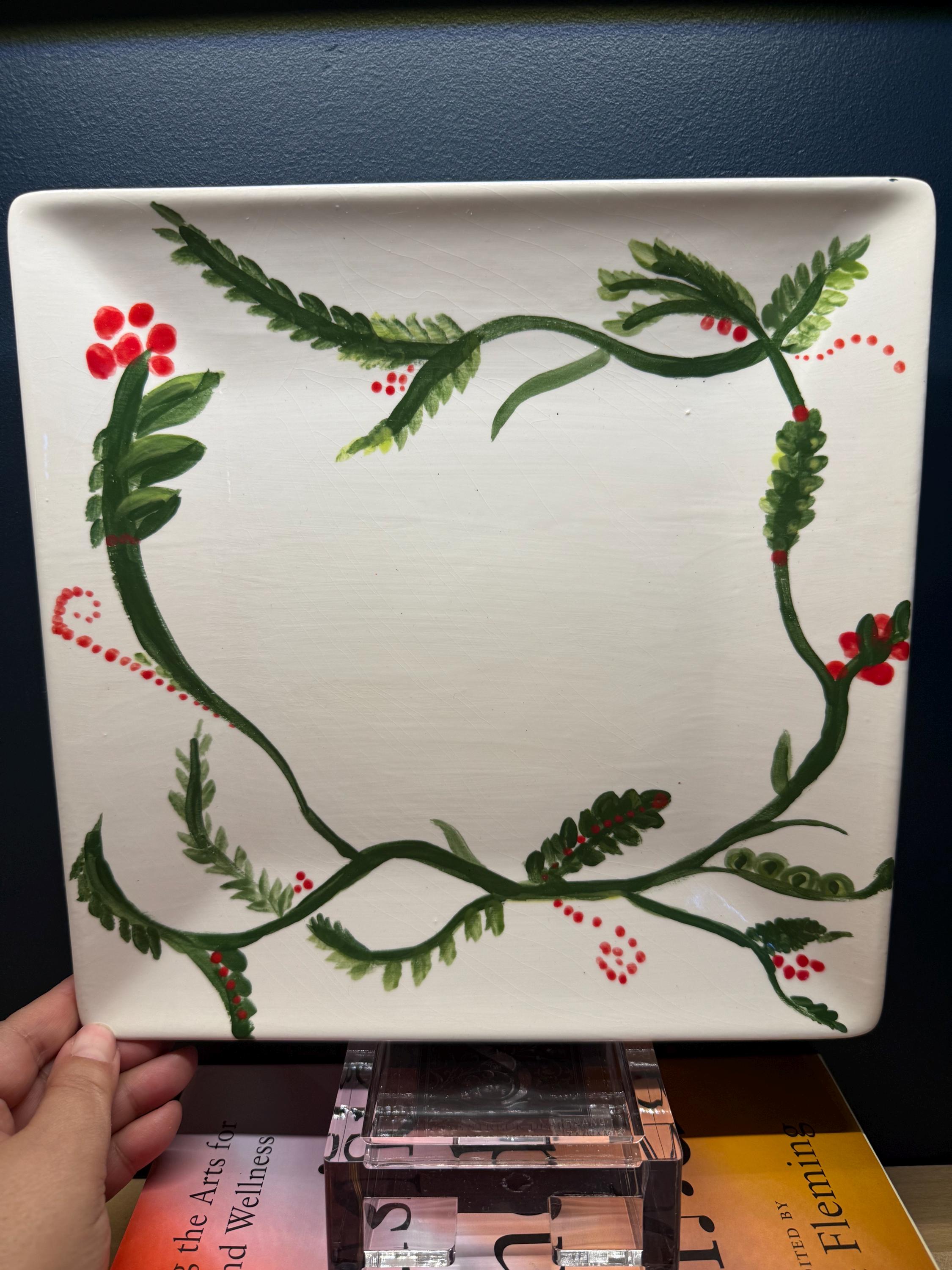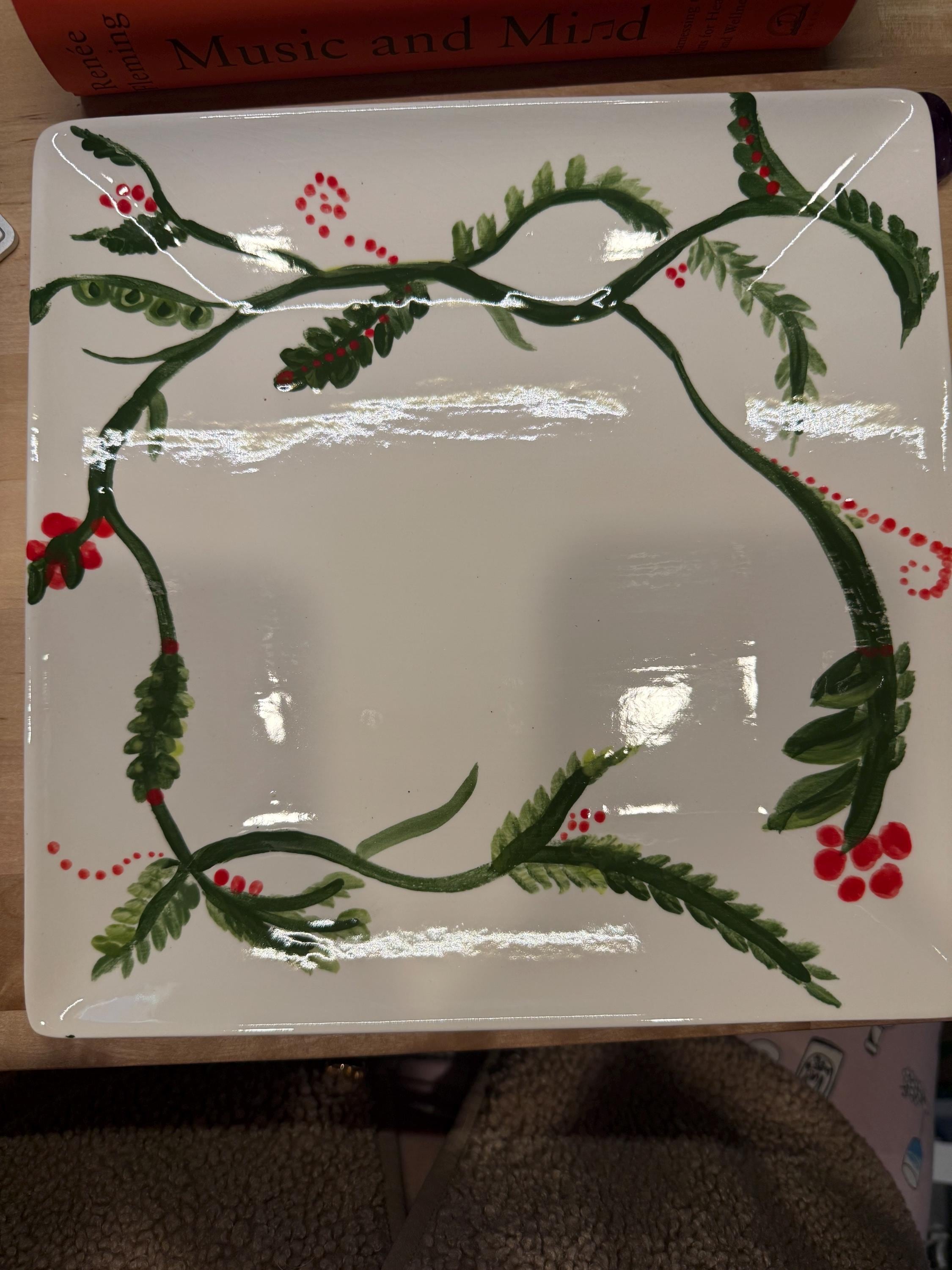 Bring bold, joyful color to your home with this one-of-a-kind hand-painted ceramic platter by artist Shannon Doyle. Featuring vibrant holy and ivy in red, green, and cobalt blue, this rectangular tray is a functional piece of art perfect for entertaining or display.
