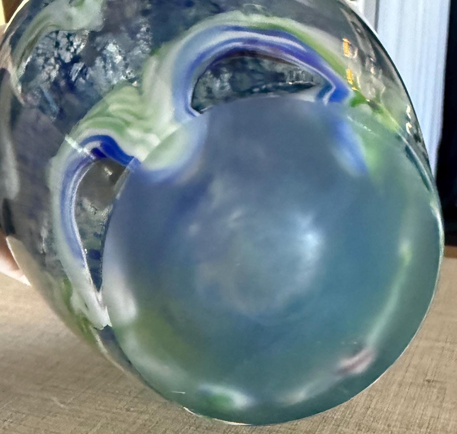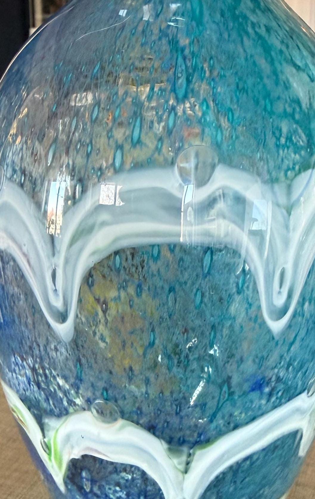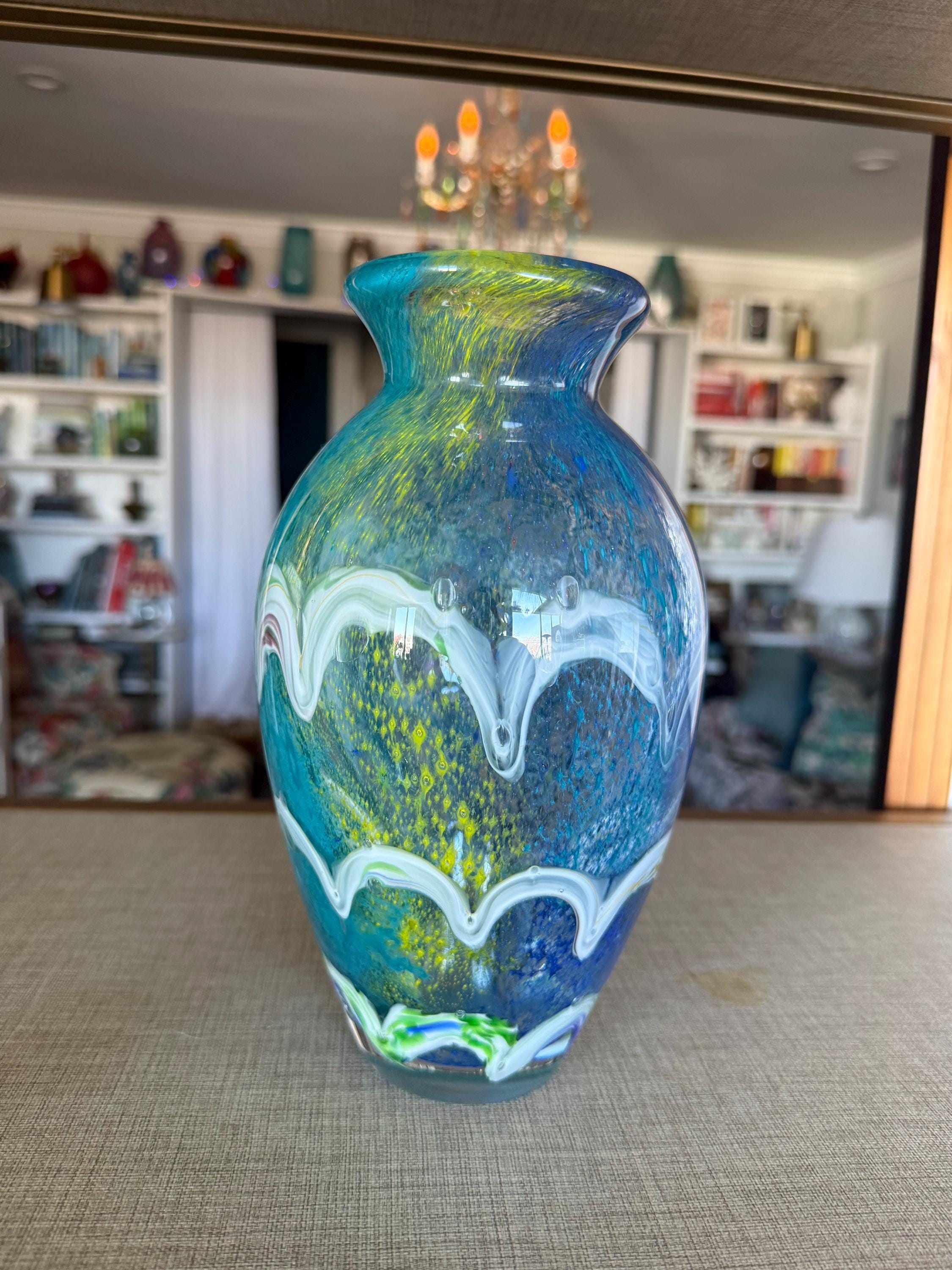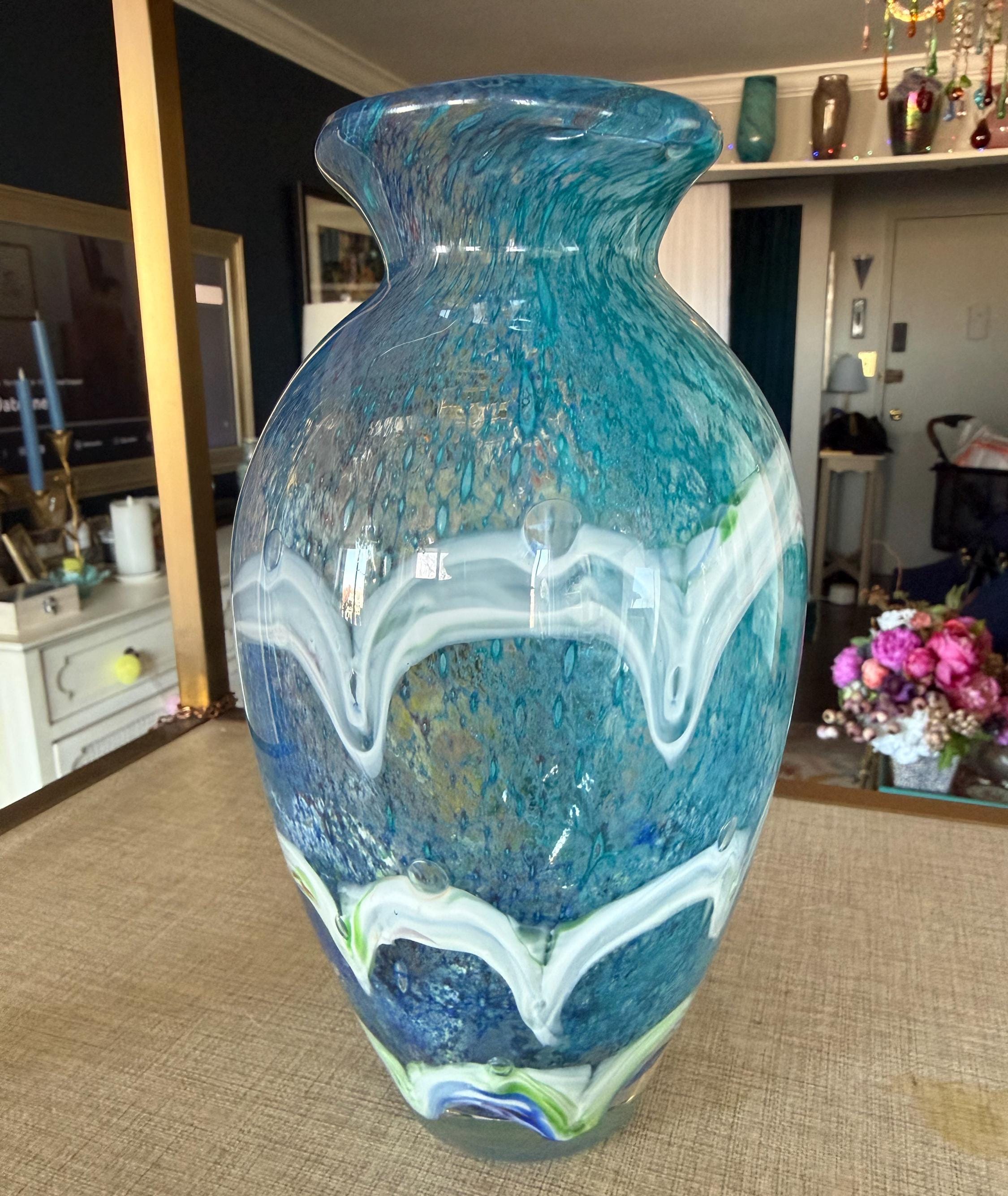Bring a calming, ocean-inspired elegance into your home with this stunning hand-blown art glass vase. Featuring layered shades of blue, aqua, and white with organic wave-like patterns, this piece evokes the beauty of sea foam and coastal waters.