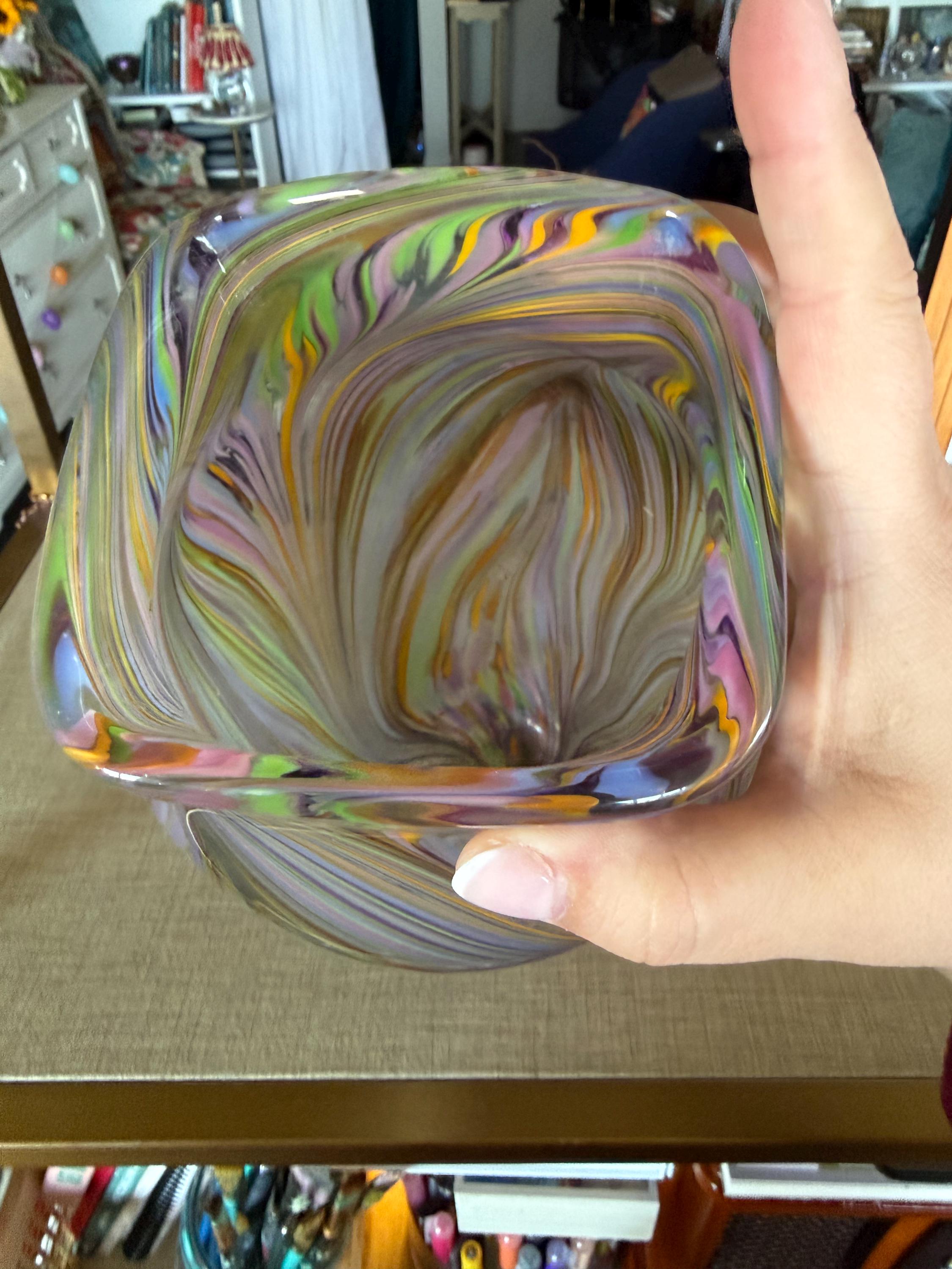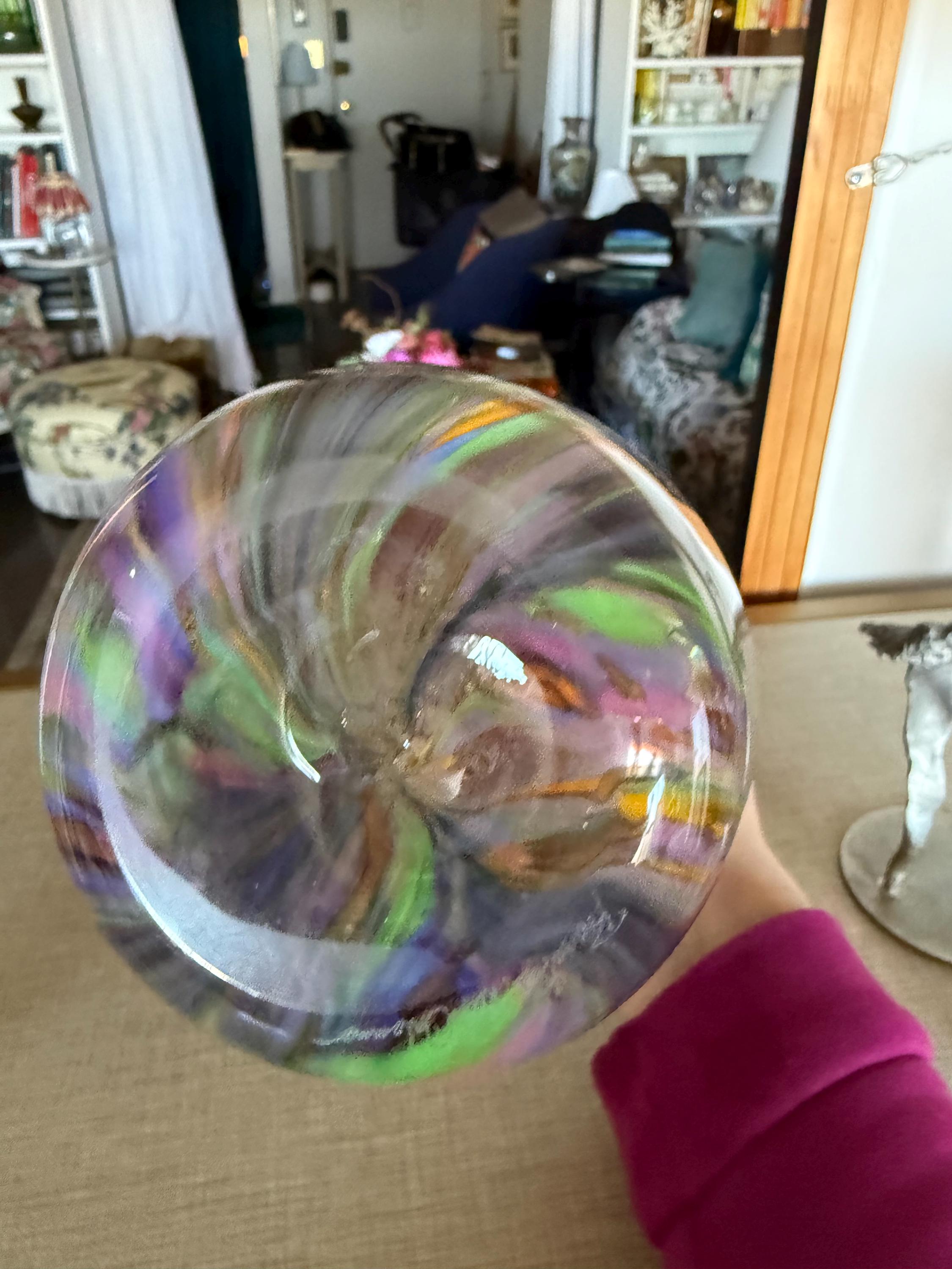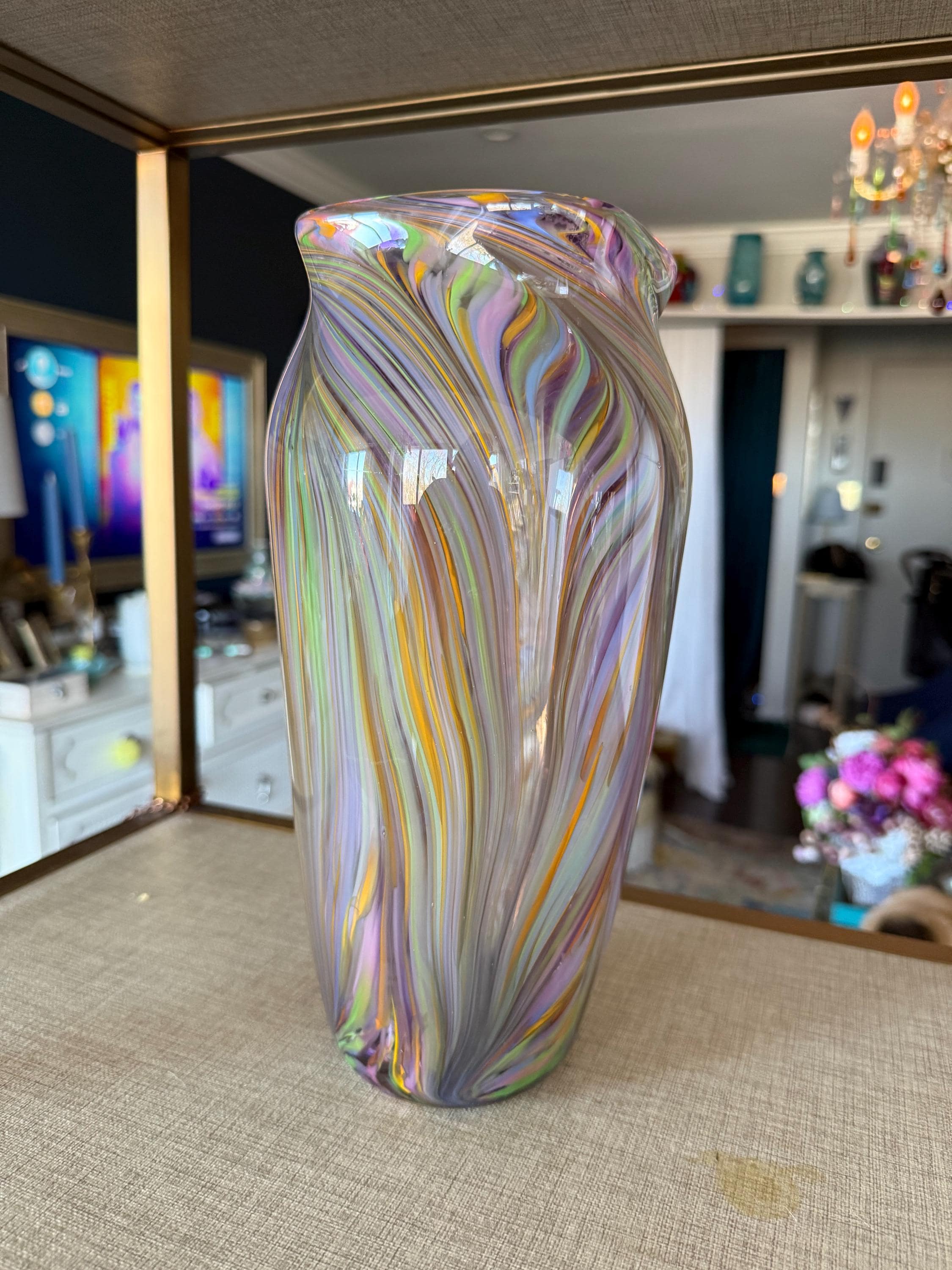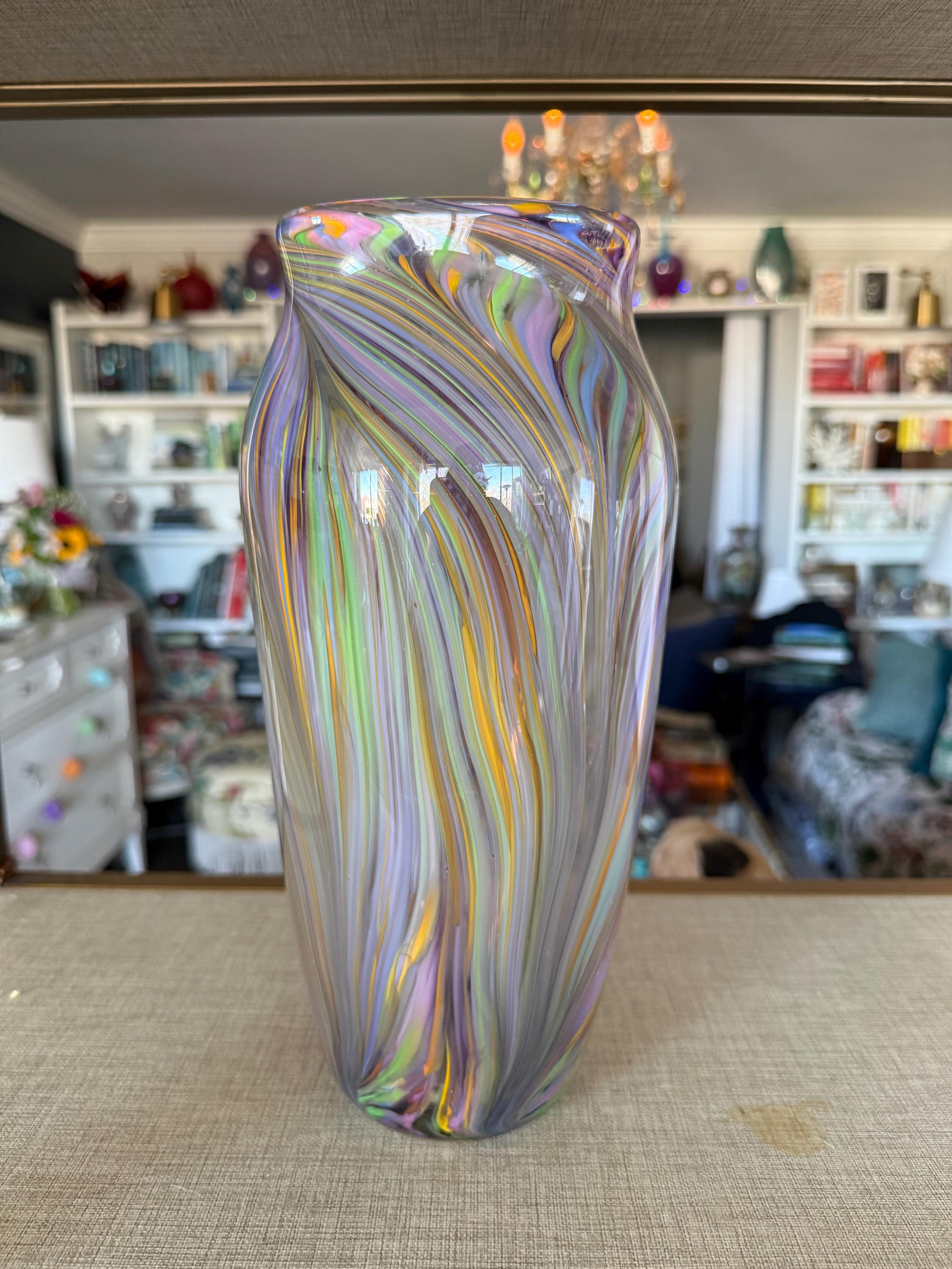 Each curve and swirl is uniquely formed, making this a true one-of-a-kind studio glass piece. The soft, rounded body and gently flared rim give it a sculptural presence—equally beautiful displayed on its own or filled with fresh or dried florals.