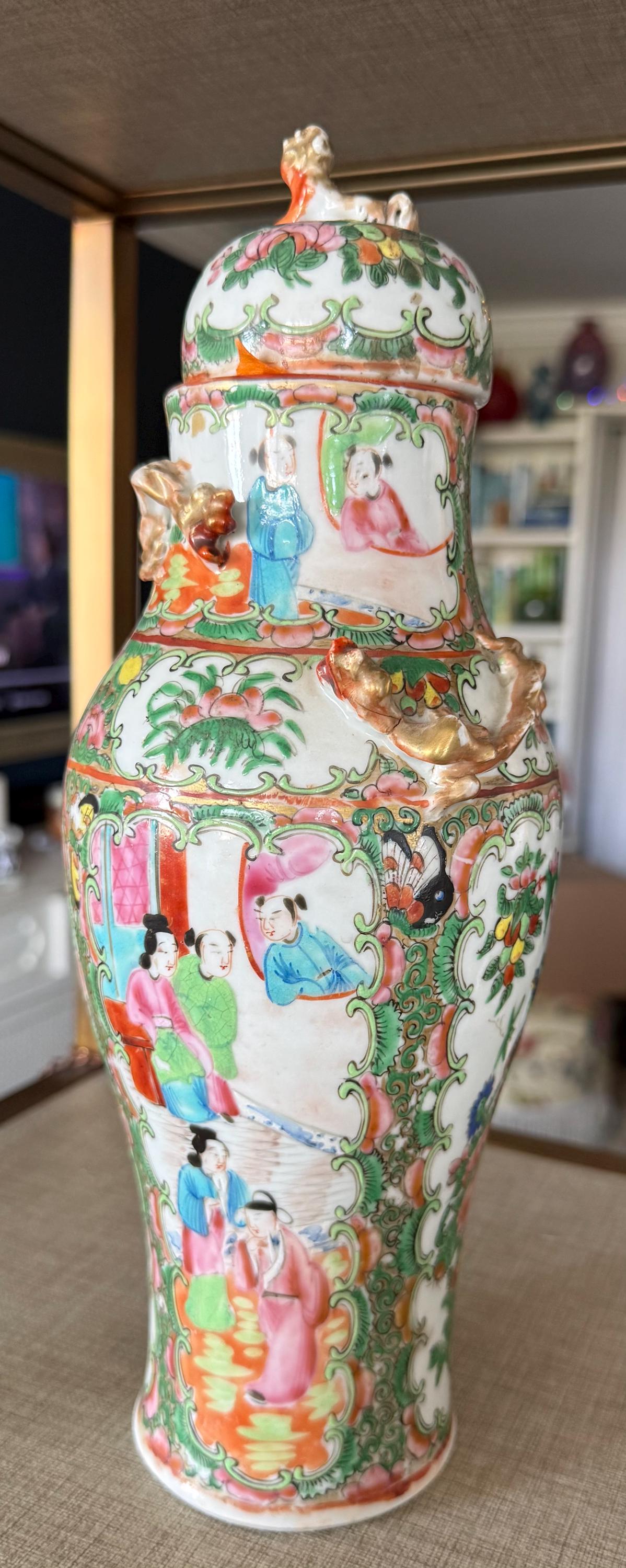 Bring timeless elegance and rich storytelling into your home with this stunning antique Chinese Famille Rose covered vase, crafted in the classic ginger jar style. This beautifully hand-painted porcelain piece features detailed figural court scenes, a hallmark of traditional Chinese artistry, framed by intricate floral and decorative borders.
