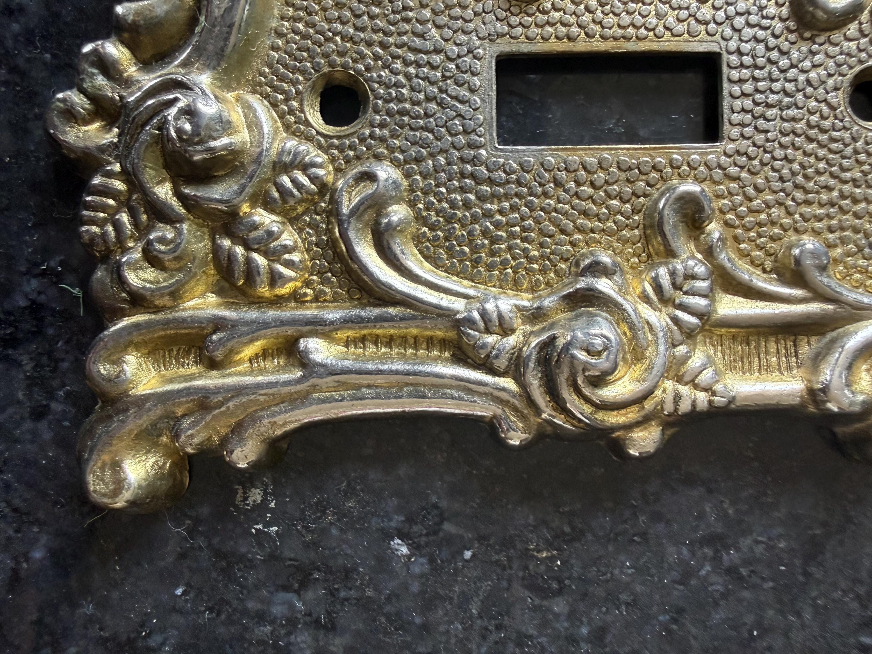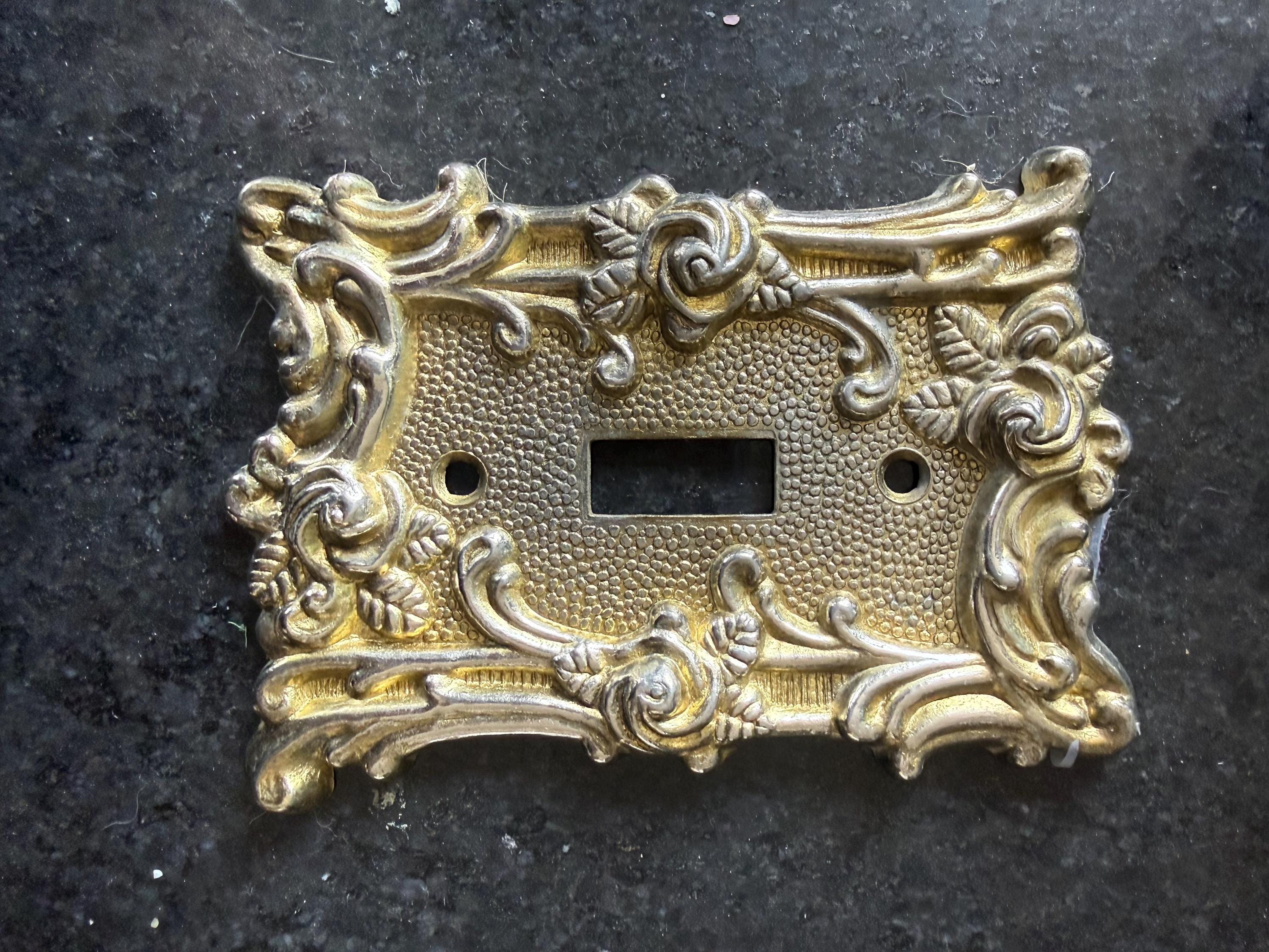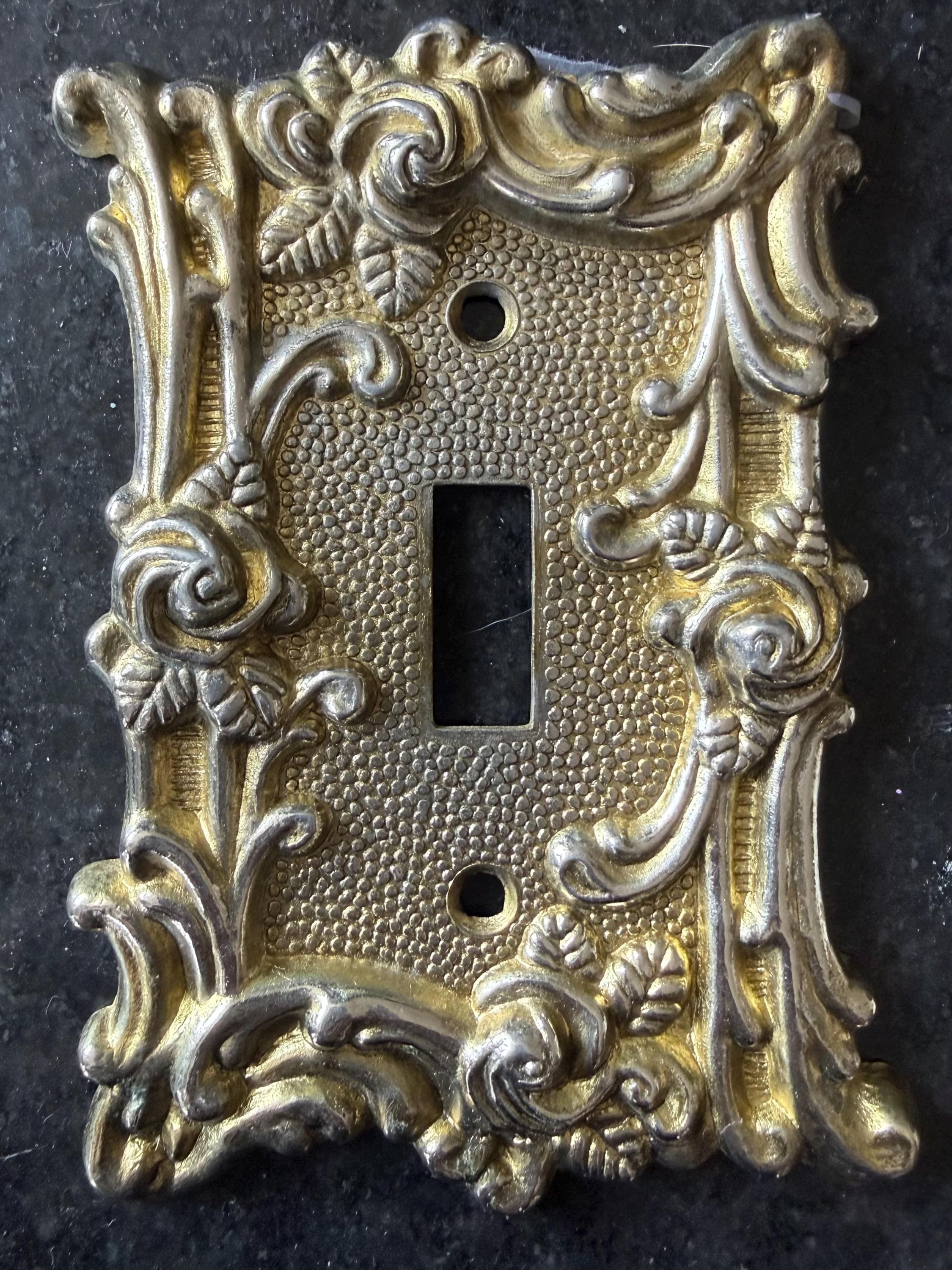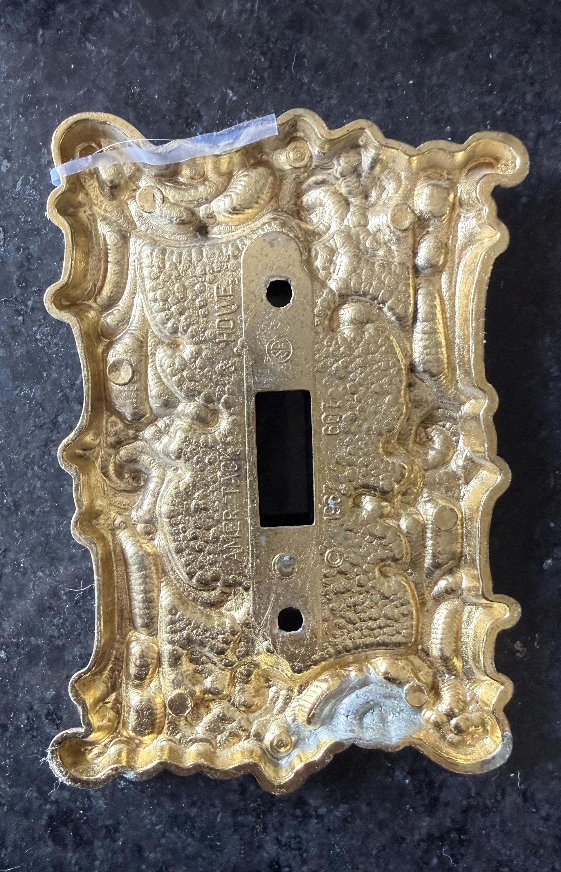 Add timeless character to your space with this vintage ornate switch plate cover by Amerock, dated 1967. Featuring an elegant Victorian-inspired scroll design with a textured background and warm brass-tone finish, this decorative wall plate brings classic charm to any room.