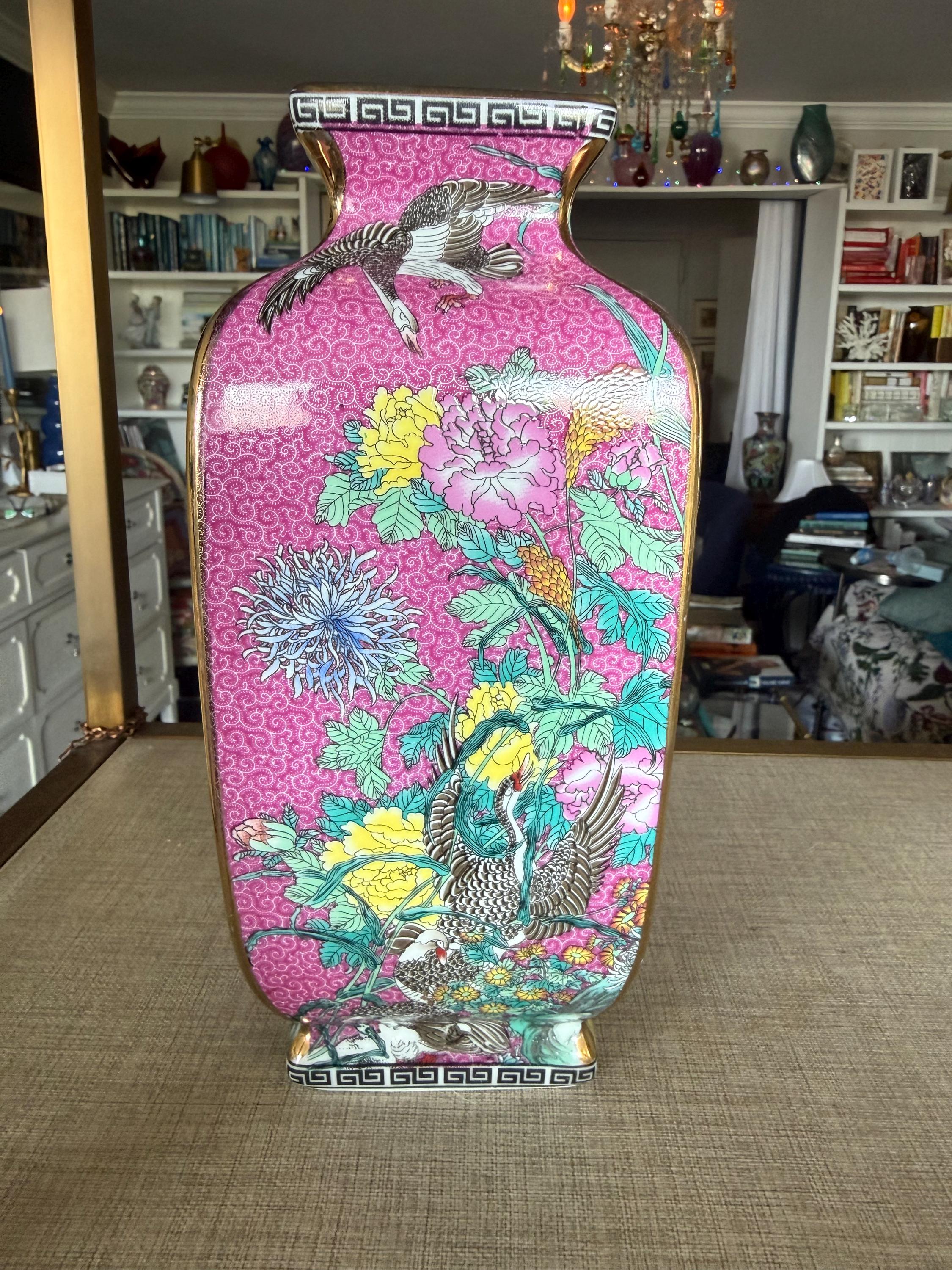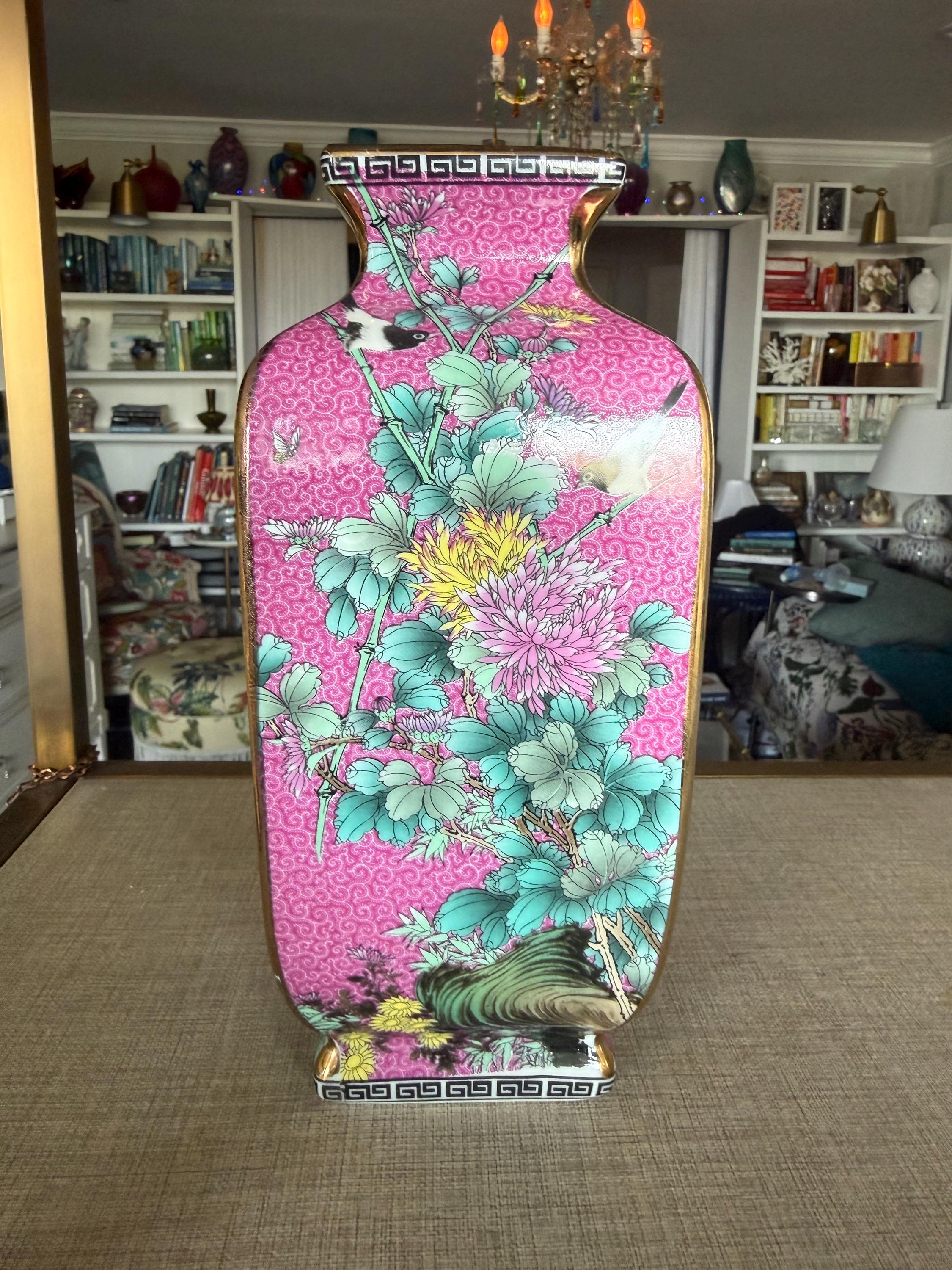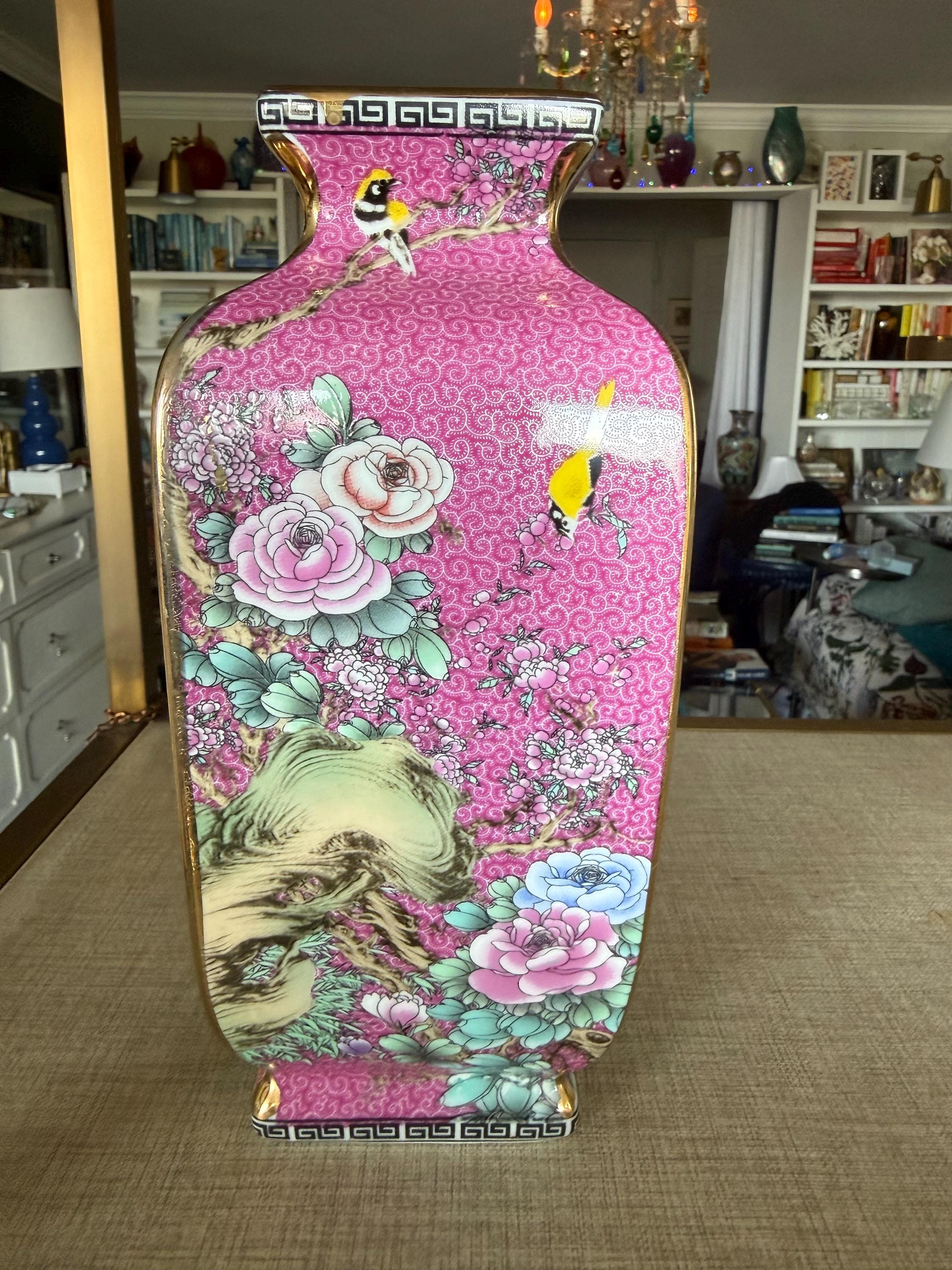 Make a bold and elegant statement with this stunning vintage Chinese Famille Rose style vase, featuring a vibrant pink ground and beautifully detailed floral and bird motif. This eye-catching porcelain piece showcases lush chrysanthemum blooms, delicate foliage, and graceful birds, all hand-decorated in a classic chinoiserie style.