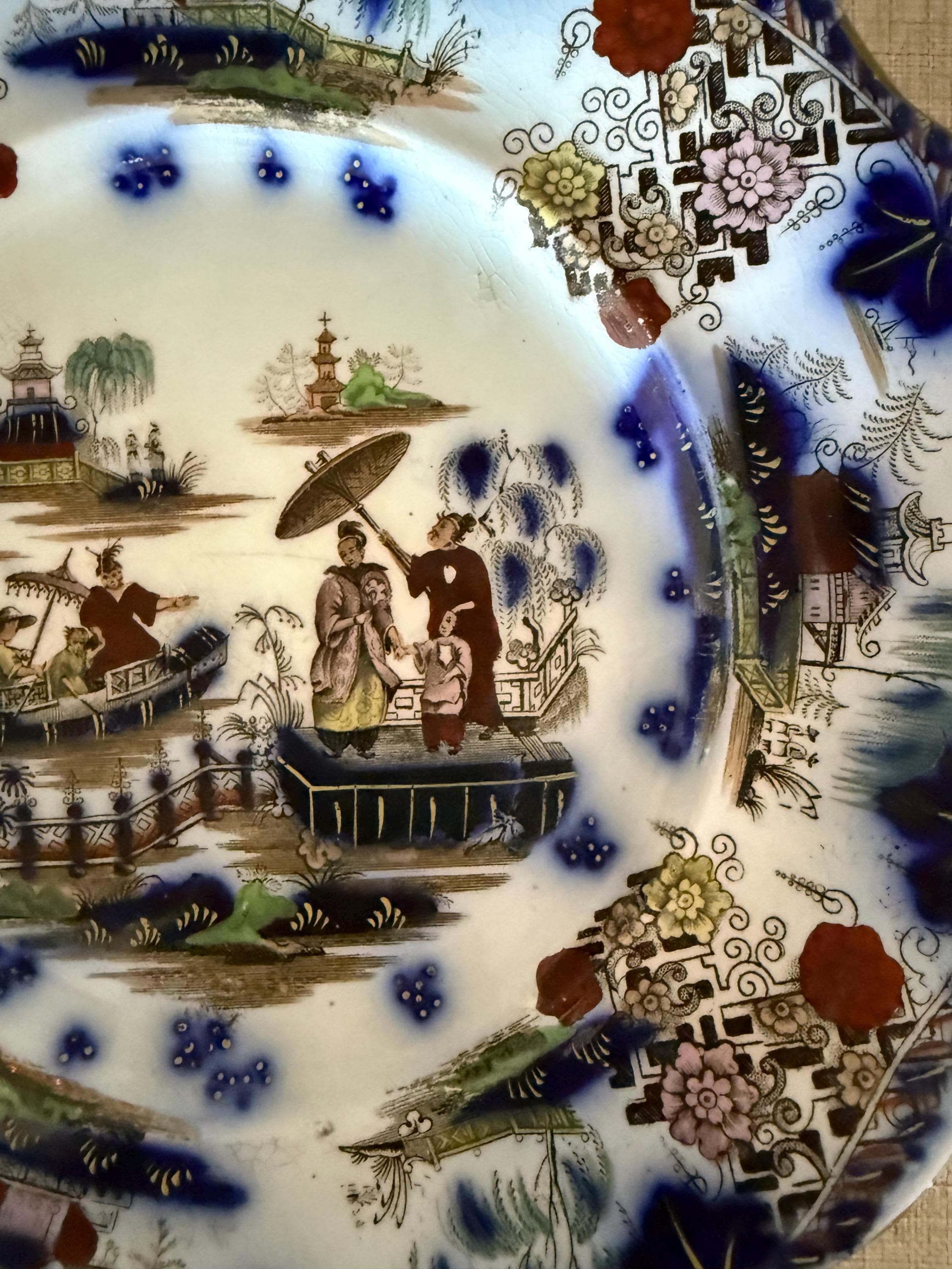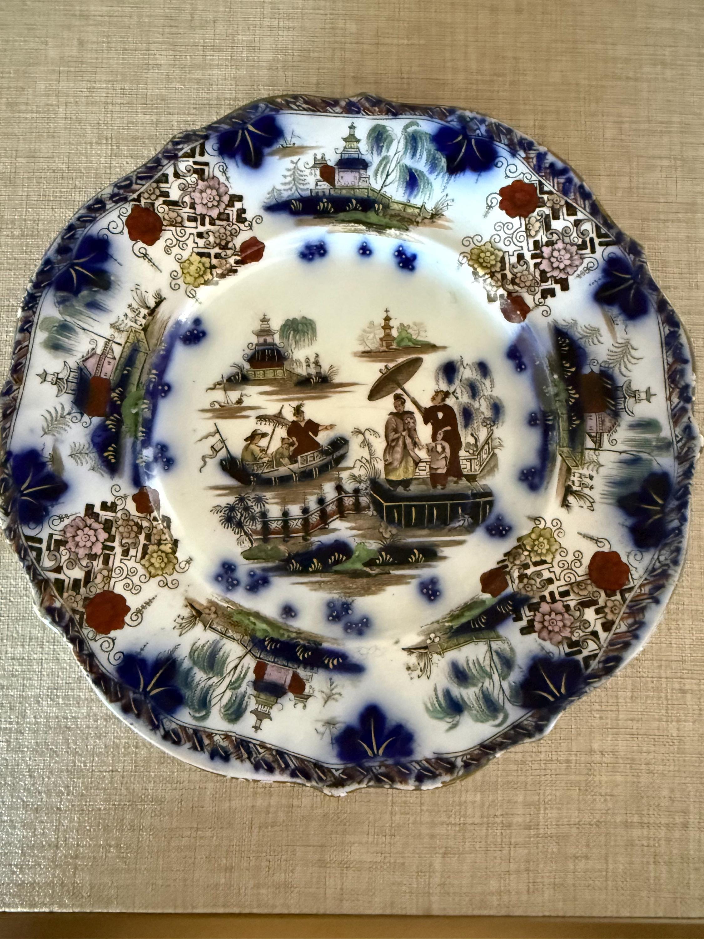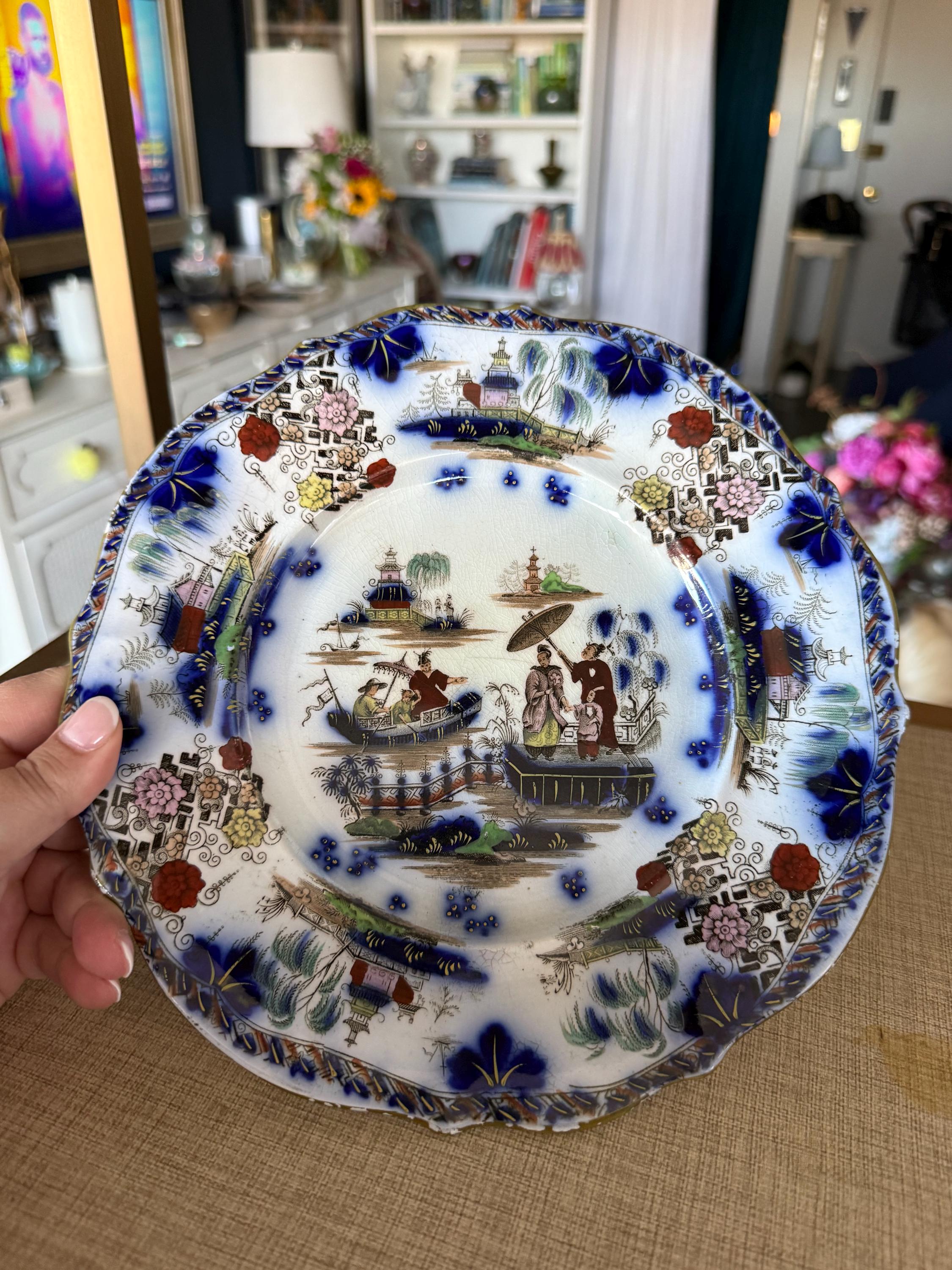 This decorative plate showcases a classic Oriental garden scene with figures, pagodas, and bridges, framed by bold blue floral motifs and geometric borders—capturing the highly sought-after chinoiserie aesthetic.